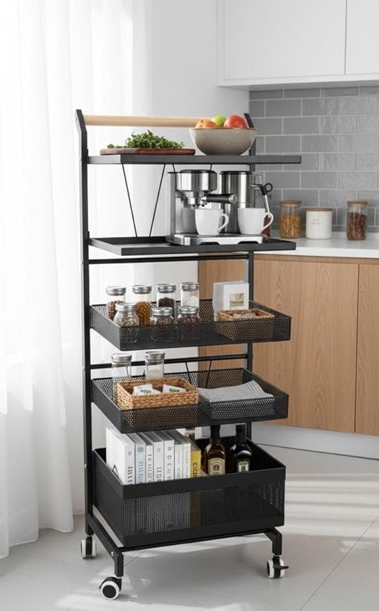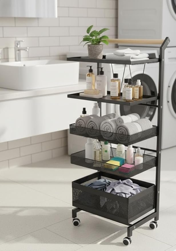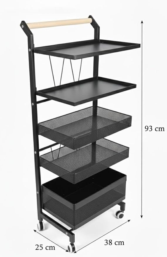 The All-In-One Organization Solution for Your Home! This stylish and functional metal utility cart is the perfect companion to declutter any room. Its smart design balances aesthetics and functionality, providing ample vertical storage space in the smallest possible footprint. Detailed Product Features & Benefits: Smart Structure and Diverse Tiers: This 5-tier cart features: Top Shelf: Ideal for display or quick access to frequently used items. Two Flat Shelves: For items requiring a stable, flat surface. Two Deep Mesh Baskets/Bins: The perforated mesh design ensures excellent ventilation and prevents water or dust buildup, making them perfect for vegetables, bathroom toiletries, or craft supplies. Highly Versatile Application: Use it as a kitchen trolley for spices and utensils, a mobile shelf in the bathroom for towels and care products, an office organizer for files and art supplies, or even in the laundry room for detergents and cleaning accessories. Built to Last: The robust frame guarantees the cart remains steady and wobble-free even when fully loaded.