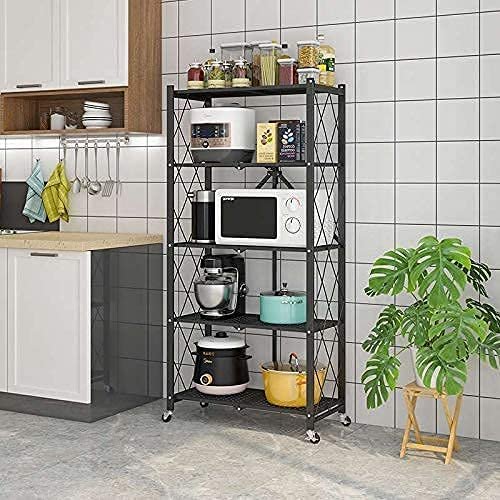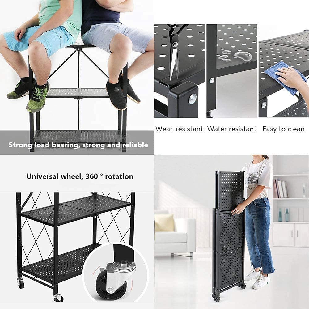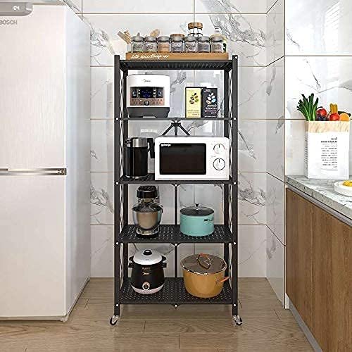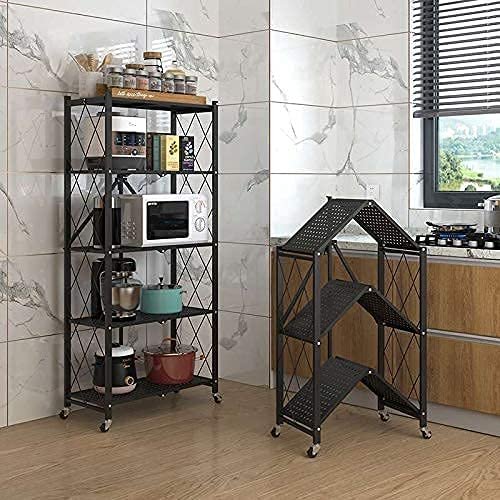 SPACE SAVING STORAGE RACK Foldable and 4 universal wheels Multipurpose Shelf Display Rack With size of 71cm L x 34cm W x 158cm H, and 4 Wheels Universal wheel would help you to make room to store large items. Bold and thick steel frame, 5-layer design, can place multiple equipment or goods. It can make the warehouse or room cleaner and more comfortable