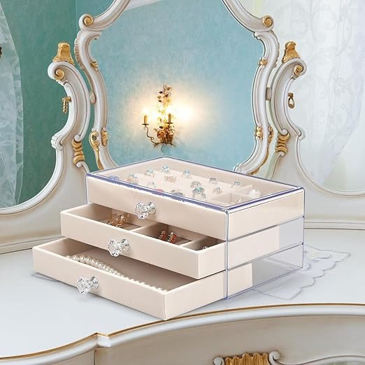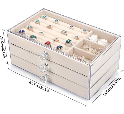 Velvet jewelry box with 3 layer drawers, each drawer attached with a diamond-like handle that slide out smoothly. Top layer has 8 slots to hold rings and earrings and 3 grid for some small jewelry. Middle layer possess 6 different section for different storage meet. And the bottom drawer with no divider can contain some big jewelry or Medallions. This Jewelry box can rearrange the drawers and trays according to your needs, DIY the space you need with the adjustable dividers in compartments, the velvet trays drawers also can be took out for use independently. Clear Acrylic Organizer is the best jewelry box to storage your jewelry and also a cosmetic storage box. So It is great gift for girls or fashion lover in your life. It can hold a lot of accessory and jewelry like rings, ear studs, necklace, pendants, bracelets, cufflinks, brooches, coins and so on. You will leads your small jewelry in order and easy to find.