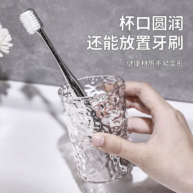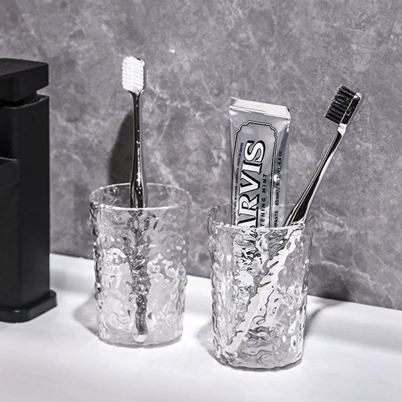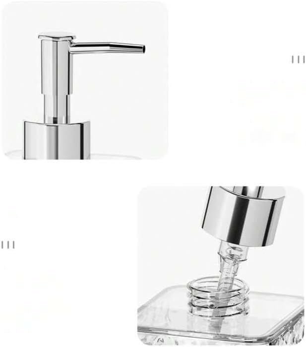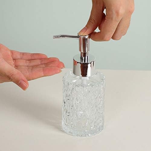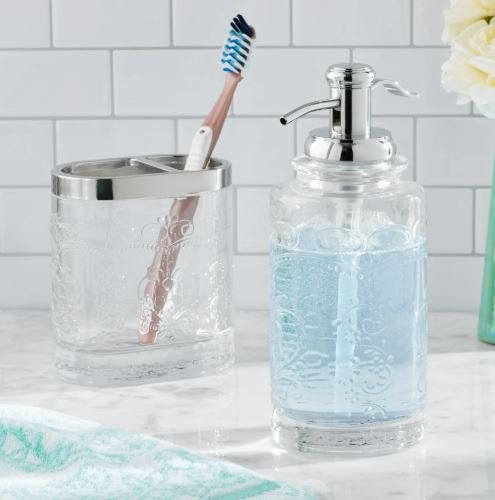 2-piece clear glass bath accessories set includes a soap dispenser and toothbrush holder Made of heavy-duty glass with an embossed design Vintage-style pump-head The refillable dispenser has a wide opening for easy refills Hand wash only Ideal for bathrooms or kitchens