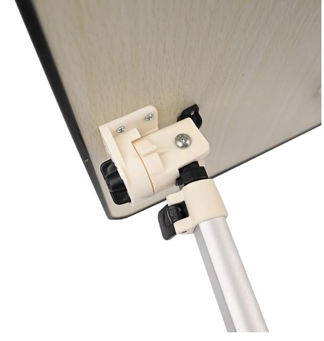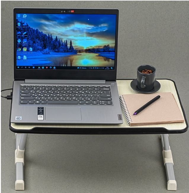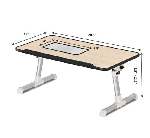 This is our brand new adjustable laptop table, which also serves as a bed desk, a couch reading stand, a standing desk for the office, or an outdoor camping table. The tabletop can be adjusted to four different heights (from 9.5 inches to 12.5 inches) to suit your needs.