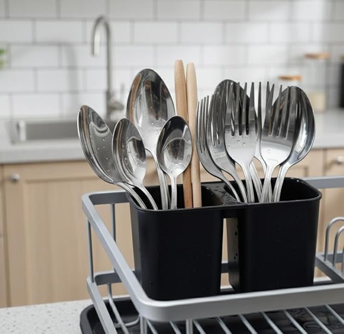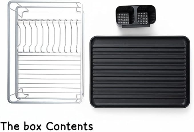 Black Dish Drainer Rack with Drip Tray - Come with a removable plastic drip tray for easy handling the excess water to keep the kitchen countertop dry and clean. Compact Size & Space Saving - Measures, the dish rack is great for most kitchen counters, solving your tableware storing and wet countertop problem. In addition, this draining board rack is washable and safe. Classify Storage - The sink drainer rack provides enough capacity to store various utensils, including dishes, plates, bowls and more. The removable utensil holder offers a extra space for your tableware. Durable & Rust-Resistant - Made of premium steel with high-temperature baking varnish, this drainer rack is rust resistant and durable to use. You don't need to worry about the counter mess at all. Super Easy Installation - Delivery with integrated rack design, tool-free assemble this kitchen drying rack. All parts, tools, and instructions needed are included. What's more, all parts can be quickly disassembled for cleaning.