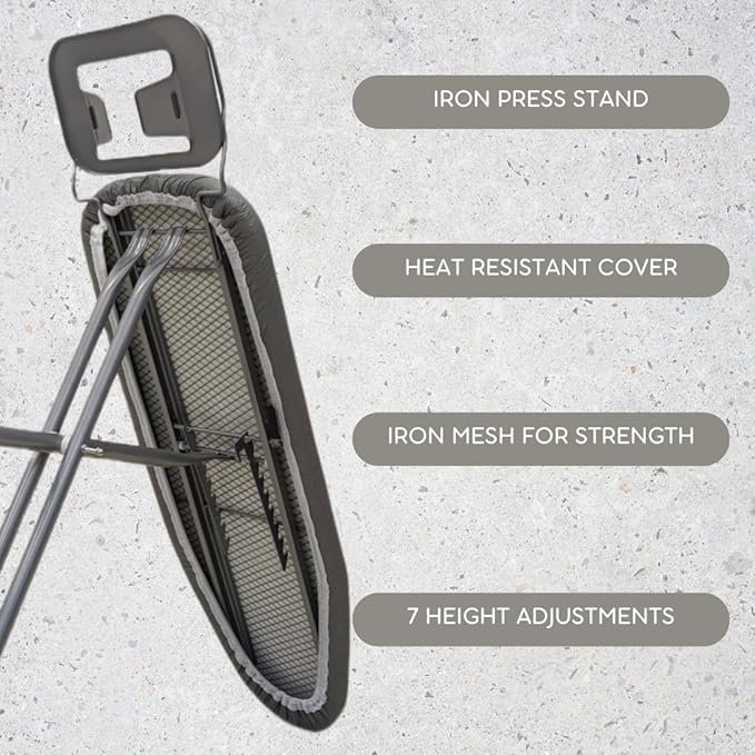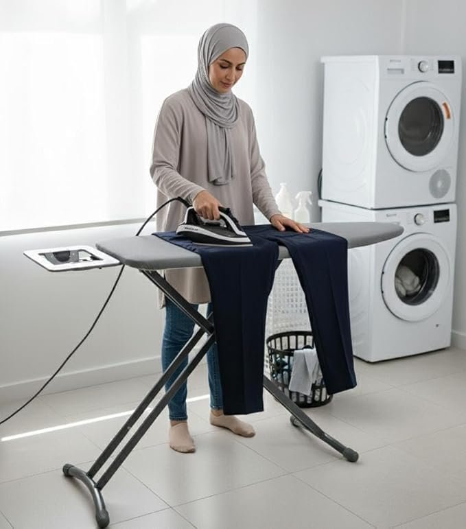 The Perfect Ironing Board for a Practical Lifestyle and Limited Spaces! Are you looking for an efficient solution for your ironing needs without taking up too much space? This foldable ironing board is the perfect choice. It is designed to combine durability with easy storage, featuring a sleek grey frame and a high-quality padded cover. It can be set up in seconds, and when you're done, it folds completely to lean against a wall or fit neatly in a closet effortlessly.