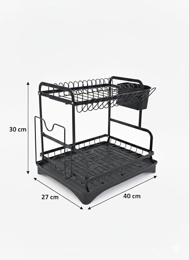 This two-tier modern and practical dish drying rack is crafted from durable, rust-resistant black coated metal. It offers ample space for efficiently air-drying dishes, cups, and cutlery, helping to keep your kitchen organized and your countertops clutter-free. The rack is equipped with plastic side attachments for draining and holding cutlery like forks and spoons, along with a removable plastic bottom tray to collect excess water, making the cleanup process simple and effortless. This drying rack is an ideal addition to any contemporary kitchen.