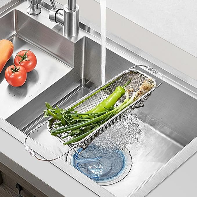 【High Quality Material】: Over the sink colander is made of high quality stainless steel material, durable, strong load bearing, not easy to deform, and easy to clean. 【Retractable Bracket】: Sink drain rack can be retracted according to the size of the sink and fits almost any size sink. 【Multipurpose】: Draining rack with feet frame on the bottom, stand to drain, can also be used as a basket for placing or displaying fruits and vegetables in or over the sink, or stand alone on a counter or table. 【Fine Mesh】: Square shape drain basket, even and fine mesh, perfect for rinsing, straining, and draining fruits or vegetables. 【Space Saving】: Kitchen colander has an ergonomic, space saving design so it doesn't take up much needed space in your kitchen cabinets.