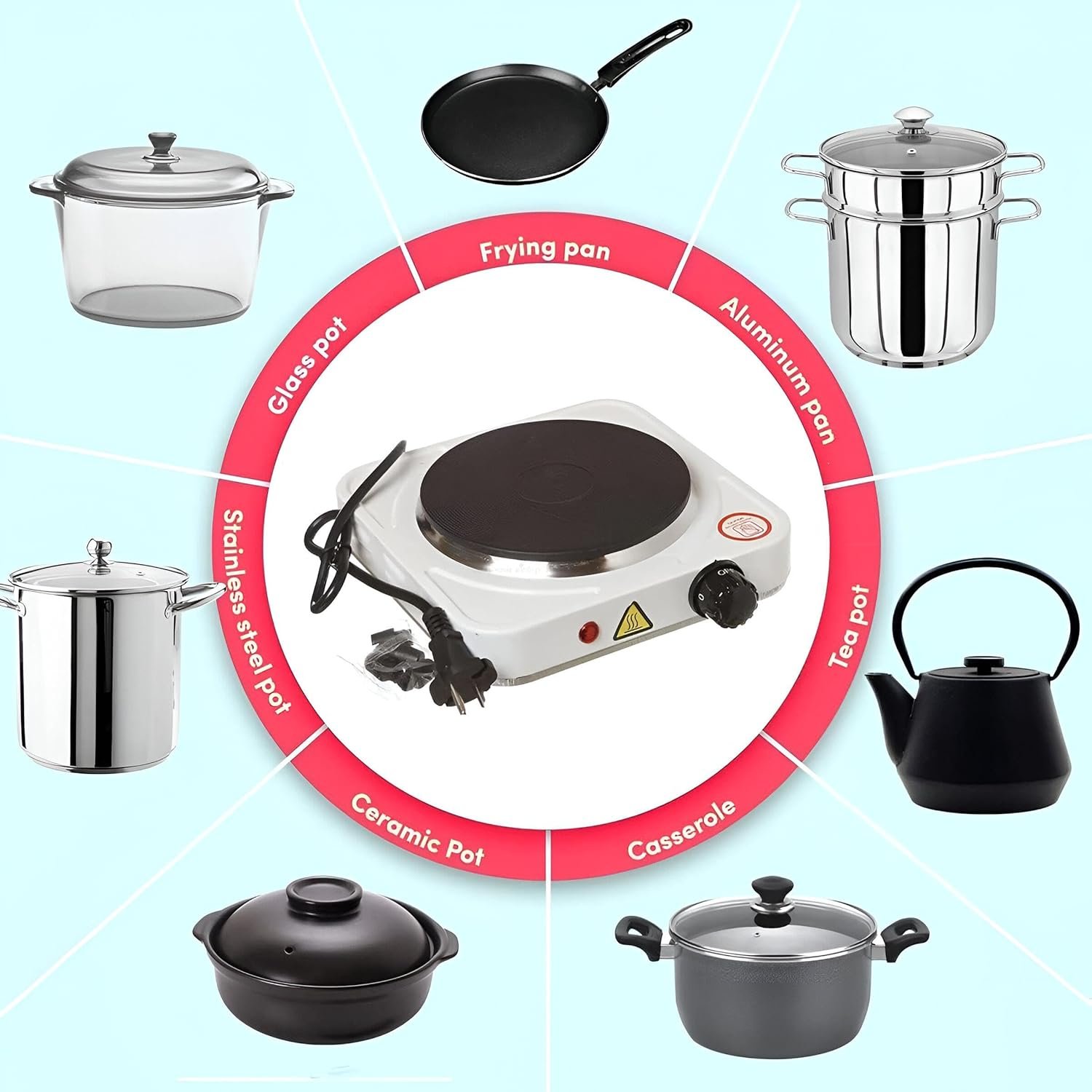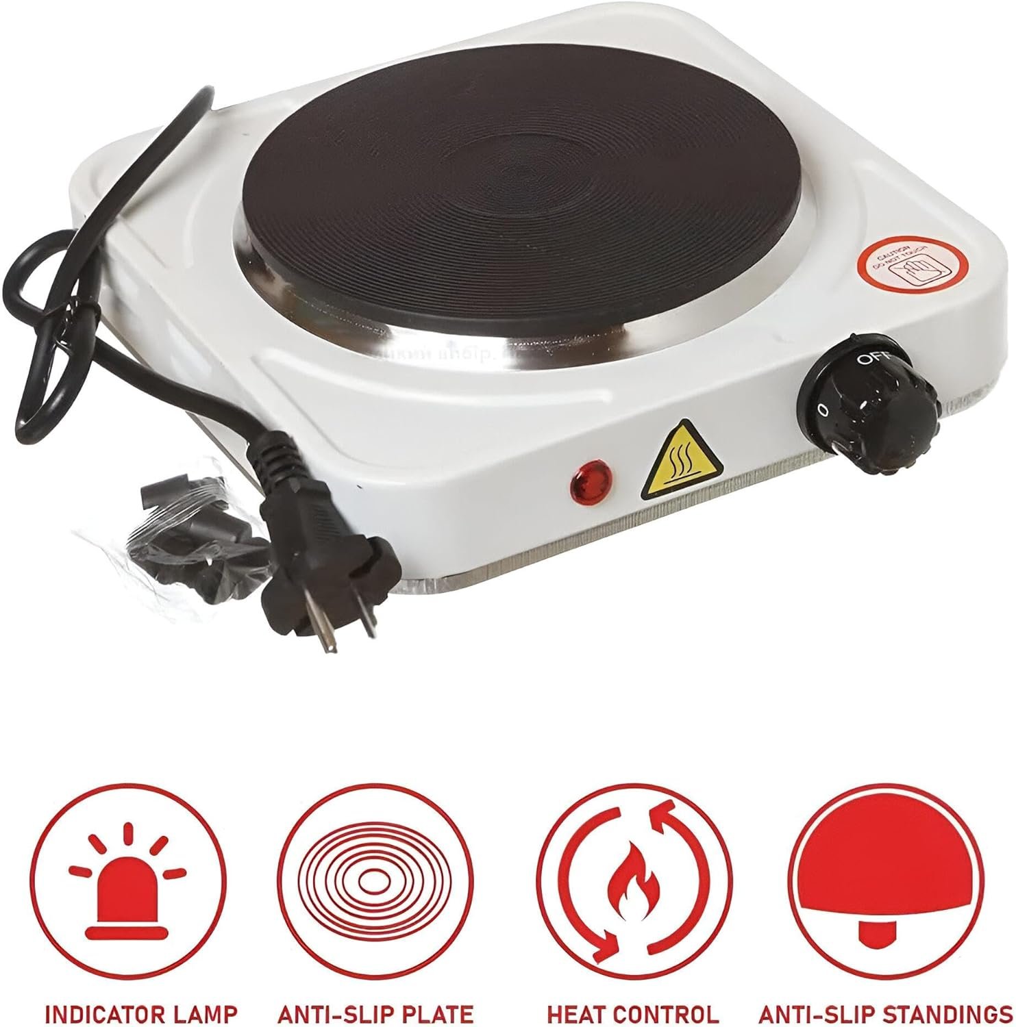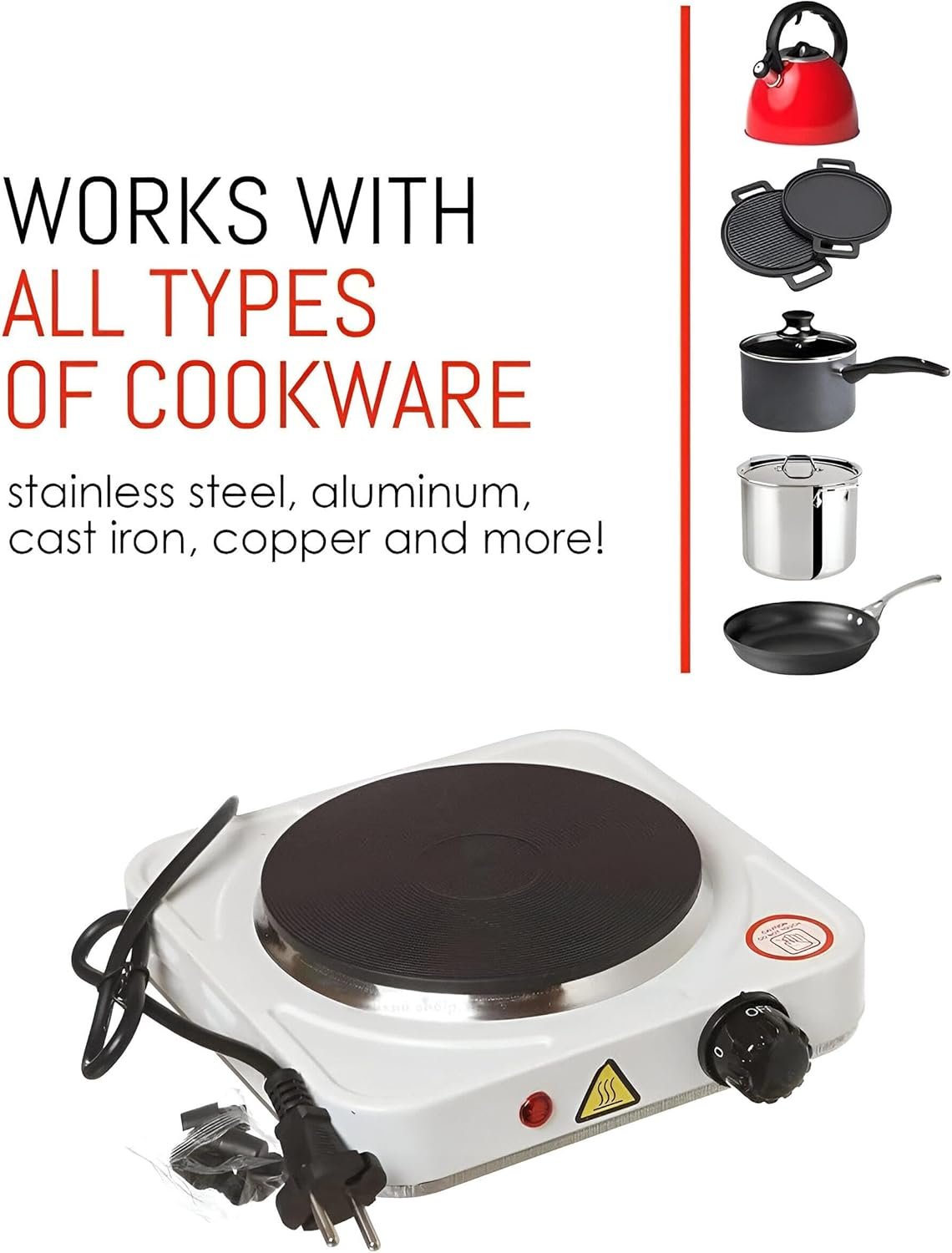 SPILL-RESISTANT SURFACE - The hard surface design prevents food from spilling inside the hot dish, keeping clean and reducing the risk of burns from accidental spills, thus promoting a safer cooking environment. EXTRA DURABLE - Made of extra strong cast metal with a solid surface design that prevents food from spilling inside hot plate. This ensures longevity and durability, making it a trusted kitchen companion. Expand Your Kitchen - Its compact design takes up a little space at the table and can be easily moved, allowing you to pack it up and take it with you on trips, making the storage convenient and expanding your cooking possibilities. Extremely COMPATIBLE - Suitable for all types of utensils and pans, including glass cookware and aluminum up to 6" in size. This adaptability ensures that it can be used with a wide variety of kitchen utensils, promoting its usability. EASY TO CARRY - The compact and lightweight design makes it easy to transport and store. Ideal for small kitchens or outdoor cooking adventures, it provides flexibility without sacrificing performance.