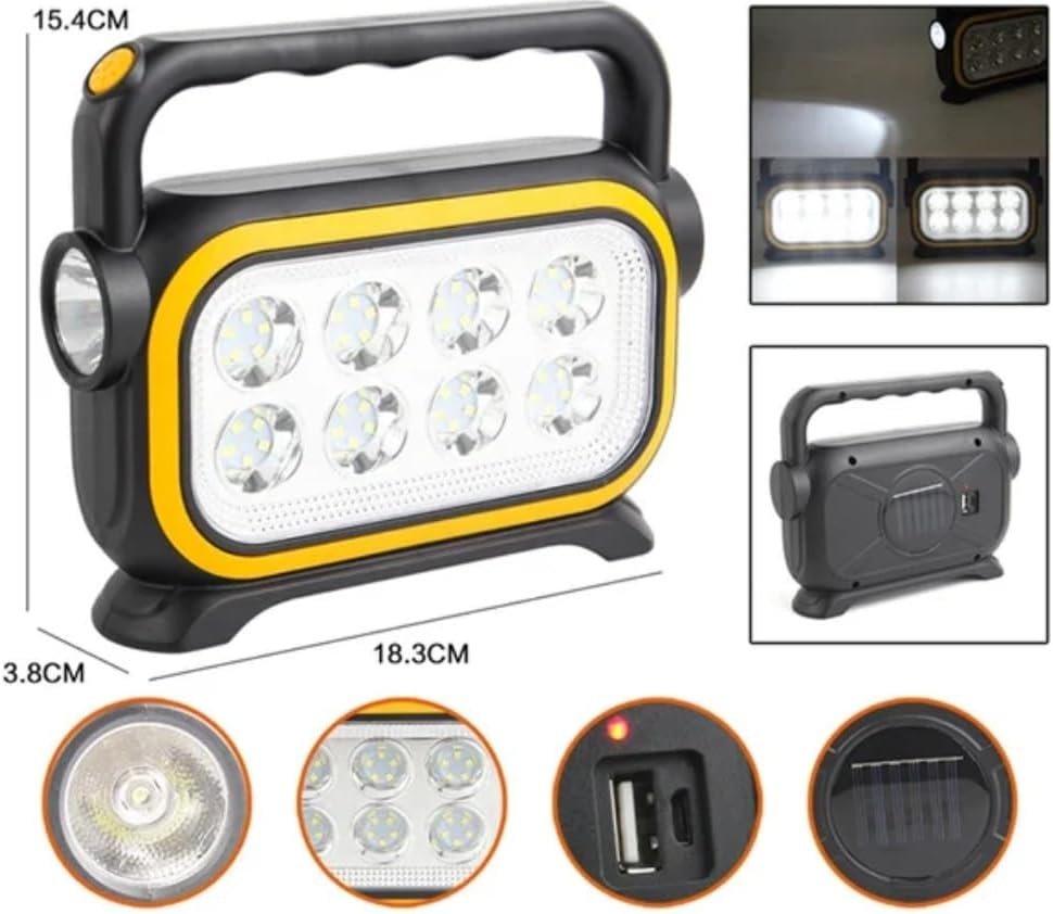 Multi Functional Solar Flashlight is a Light Weight and Water Proof. Searchlight has twin color of light White(LED) light. This torchlight can be charged with Solar panel as well as with electricity. It has USB charging facility, so in an emergency situation, you can charge your mobile also. It is made of very strong ABS Plastic material in case of slipping from hand or falling from the height, Flashlight has ability to absorb impact of 1 meter height. It takes only 2 to 3 hours for full charging the battery.