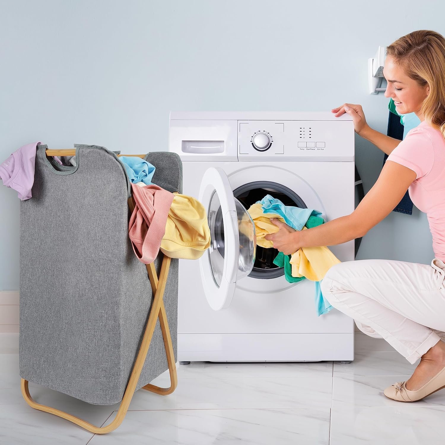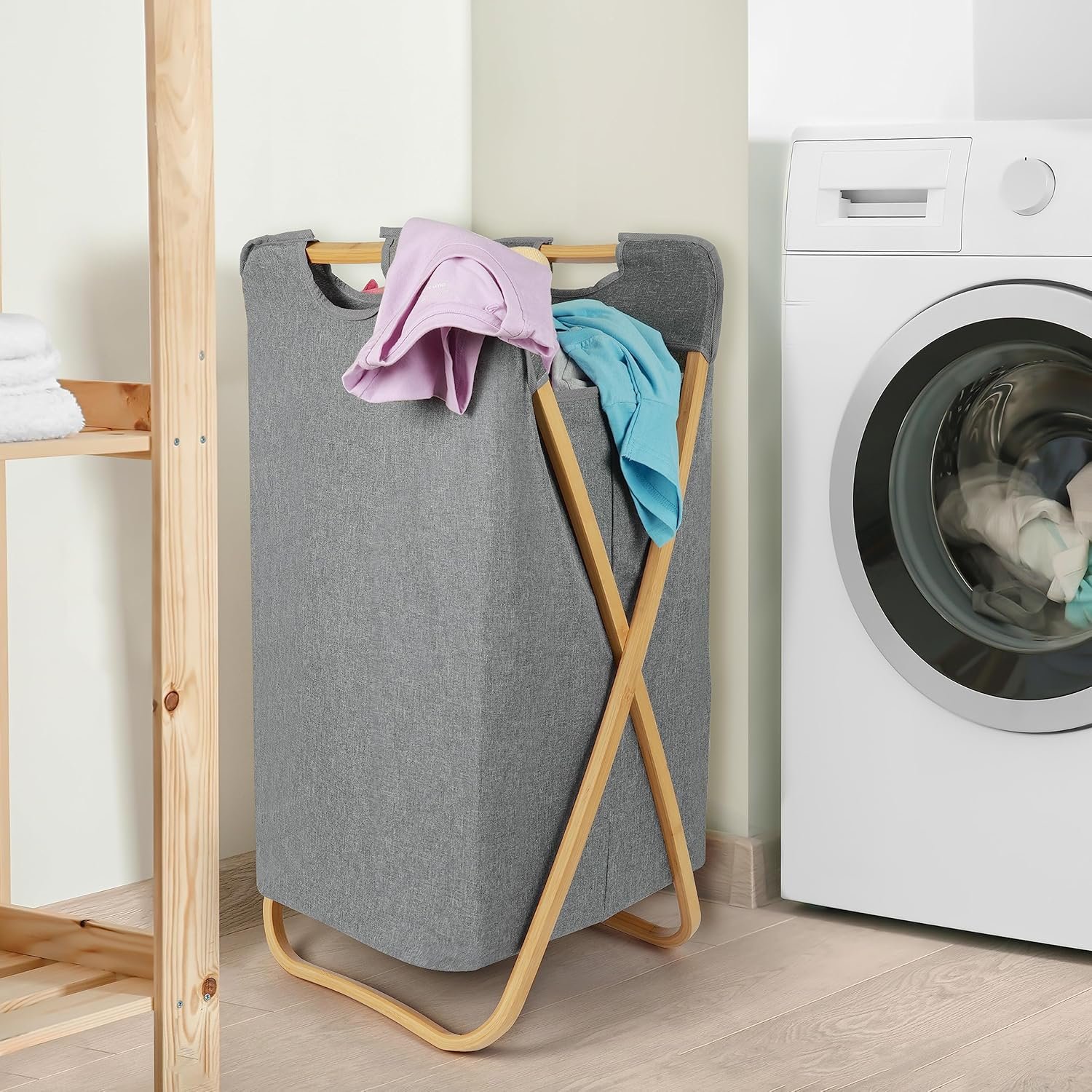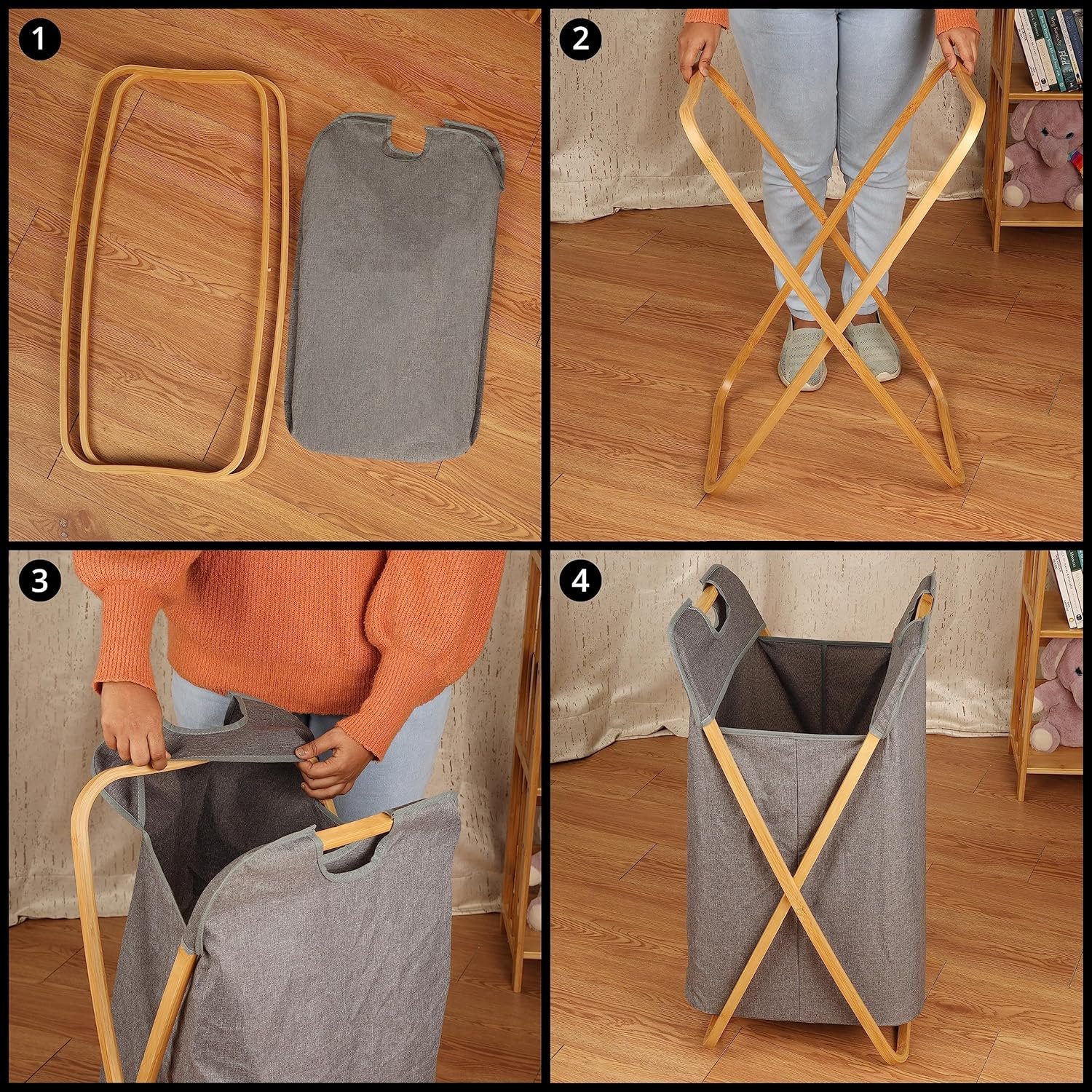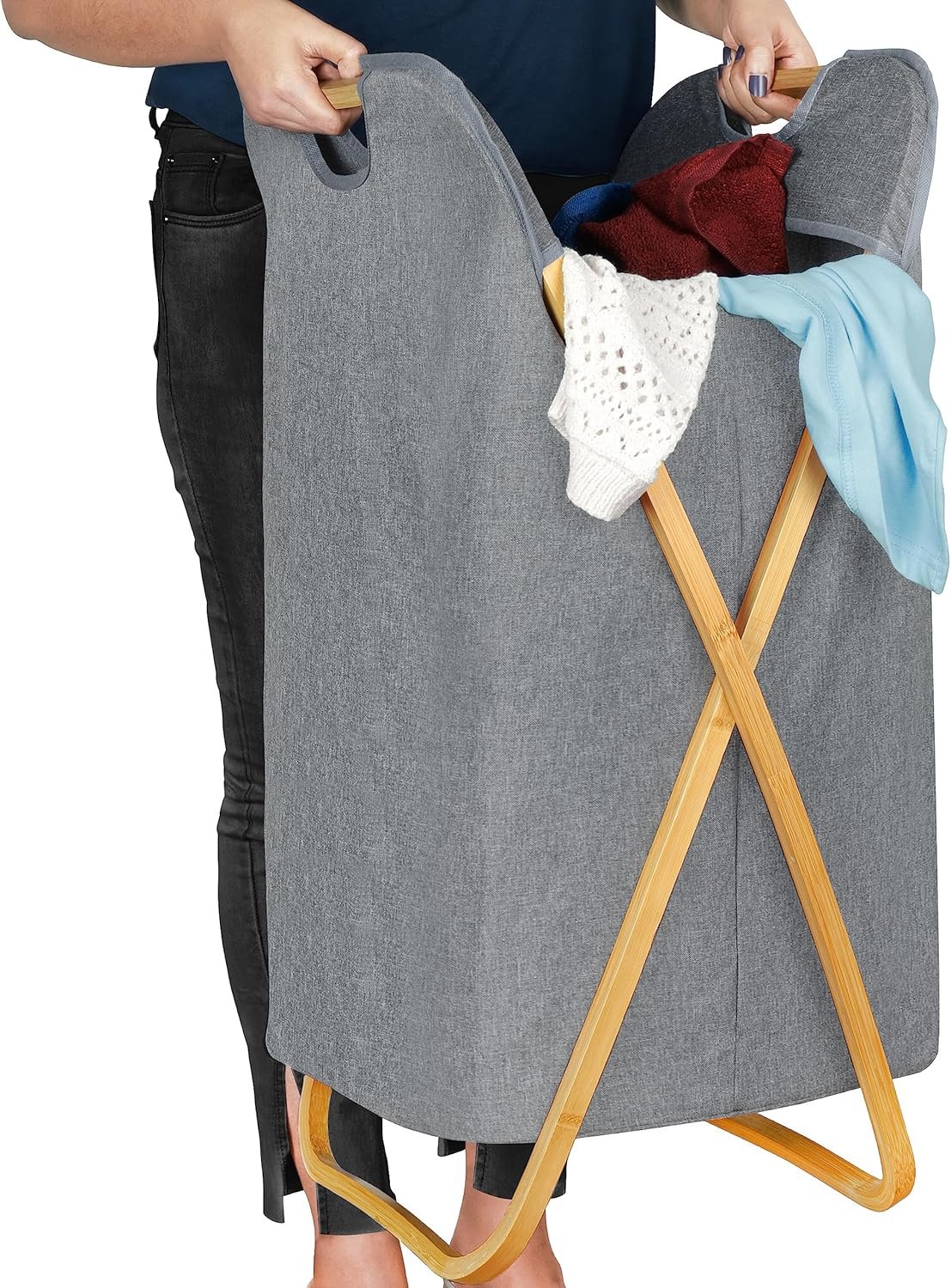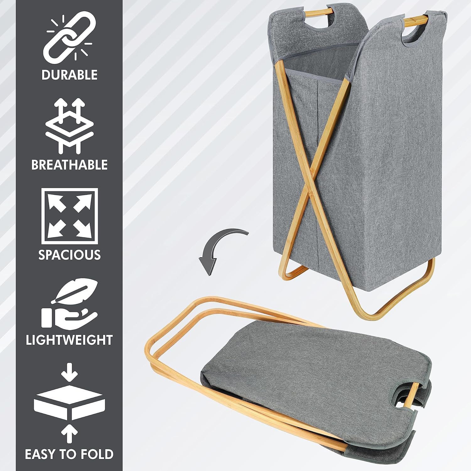 DURABLE MATERIALS: Our stylish laundry bin is made from durable, waterproof fabric with a bamboo frame; The frame provides handles for easy transportation when moving the bin around your home; The fabric material is odourless, environmentally friendly and breathable SPACE-SAVING DESIGN: This linen basket is also collapsible; The foldable design lets you store away the basket when not in use, saving you space and keeping your home clean/tidy; The bin is quick/easy to assemble and will fit comfortably in your closet, bedroom, bathroom, laundry room or dorm