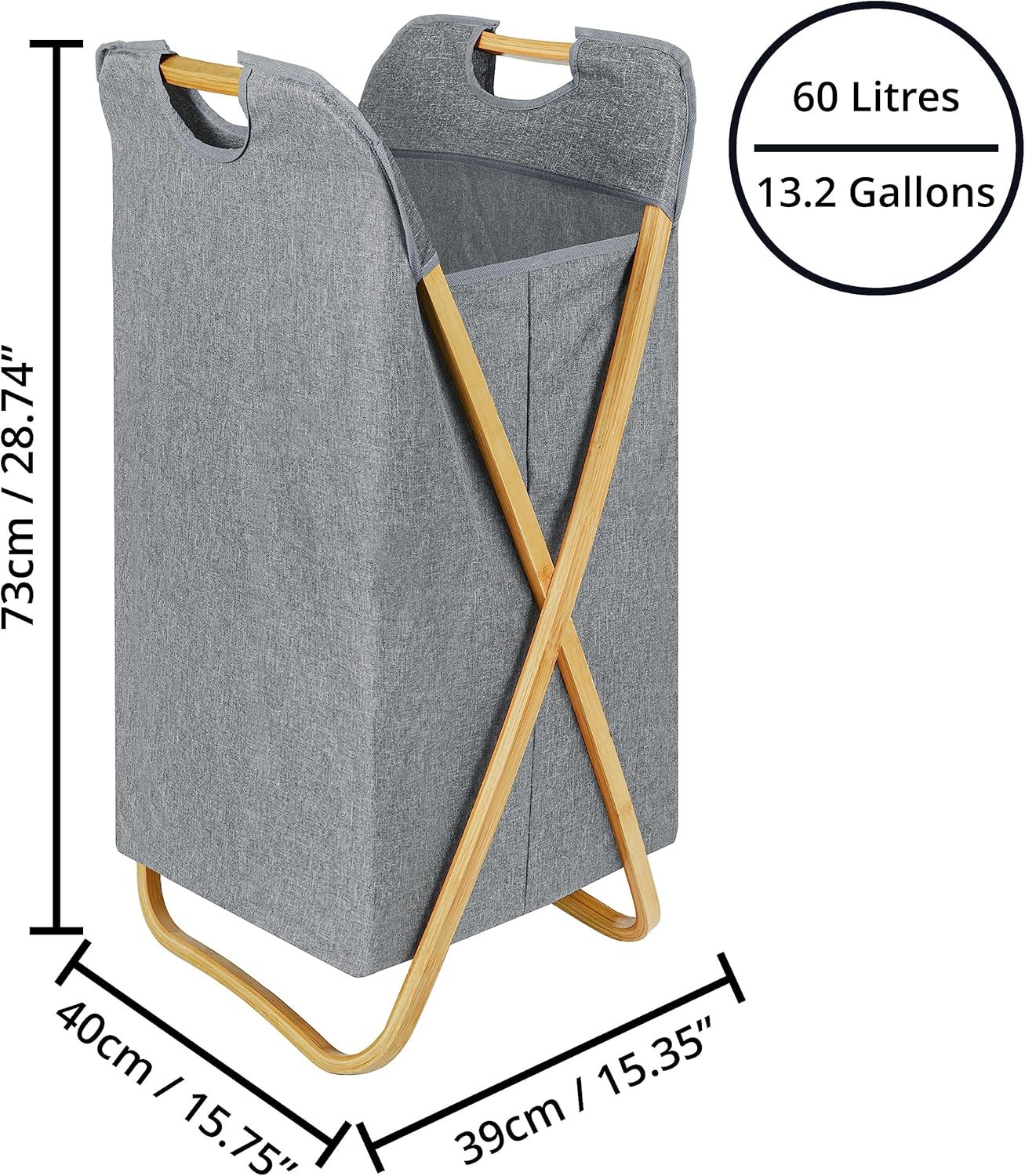 60L LAUNDRY BASKET: Our 60L laundry basket has a large capacity, perfect for discreetly storing dirty clothes; The hamper measures W40 x D39 x H73cm (15.75 x 15.35 x 28.74 inches), with enough space for your whole family