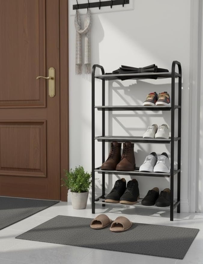 Practical Design: Offers 5tiers for storing shoes in an organized and tidy manner. Durable Structure: Made of a black plastic frame and strong metal rods to ensure stability and durability. Easy to Assemble: Can be easily put together and installed without the need for complex tools. Versatile: Suitable for entryways, bedrooms, or any place where you need to organize shoes. Lightweight: Easy to move and reposition anywhere.