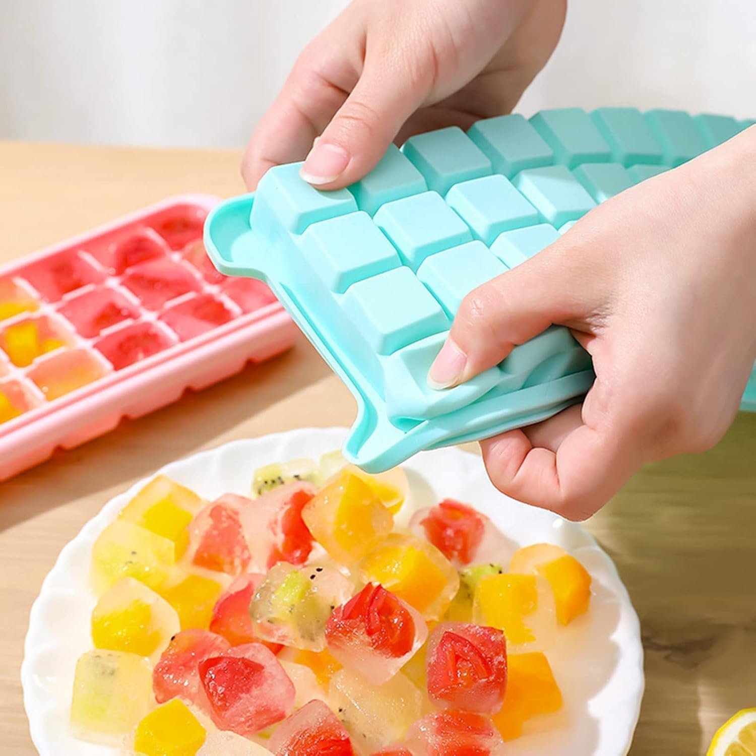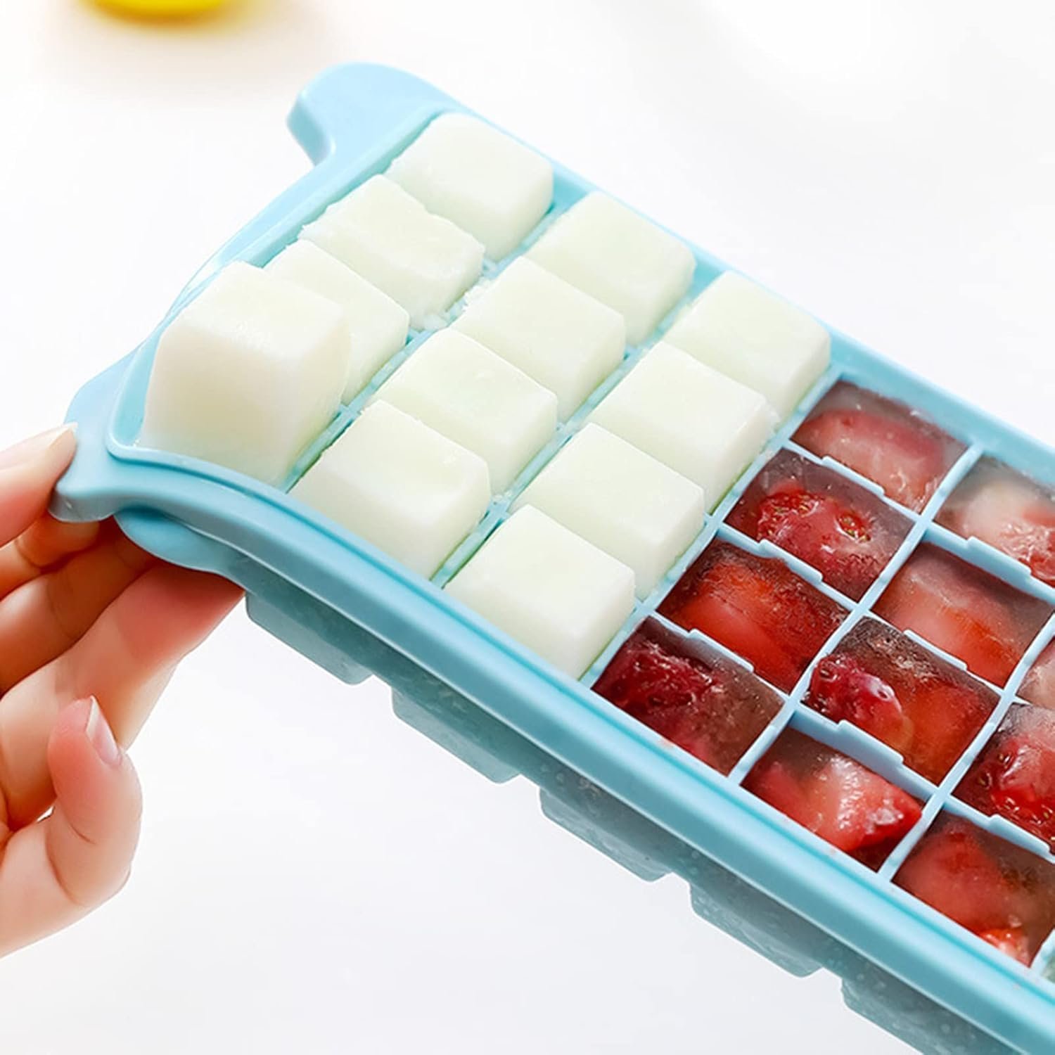 The ice cube tray is very flexible, so you can easily release cubes out of the tray bottom. Coming with a removable lid, it can prevent other foods in the refrigerator from affecting the taste of ice cubes. Made from silicone material, this mold is safe and healthy to use. The style of 24 grid and the style of 36 grid differ in size. You can refer to size details. You can use this ice cube mold to make ice for coffee, make kids chocolate snacks, homemade butter confectionery or baby food