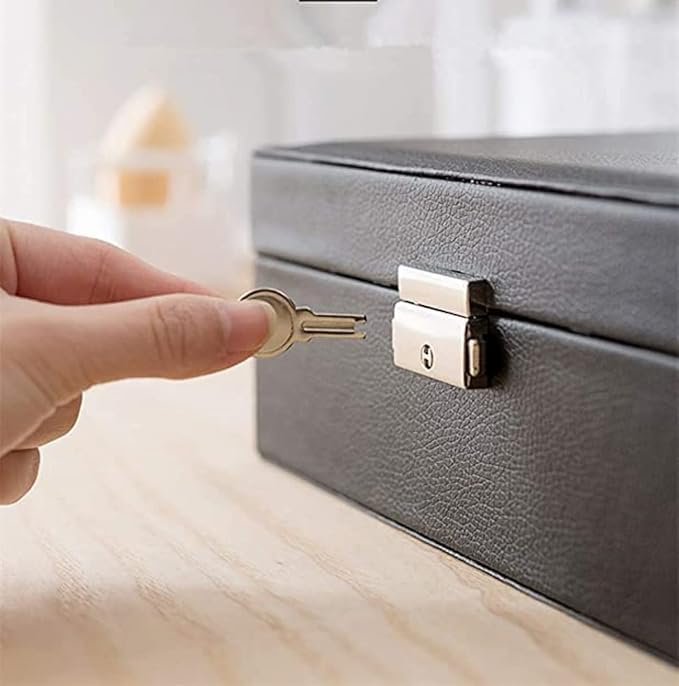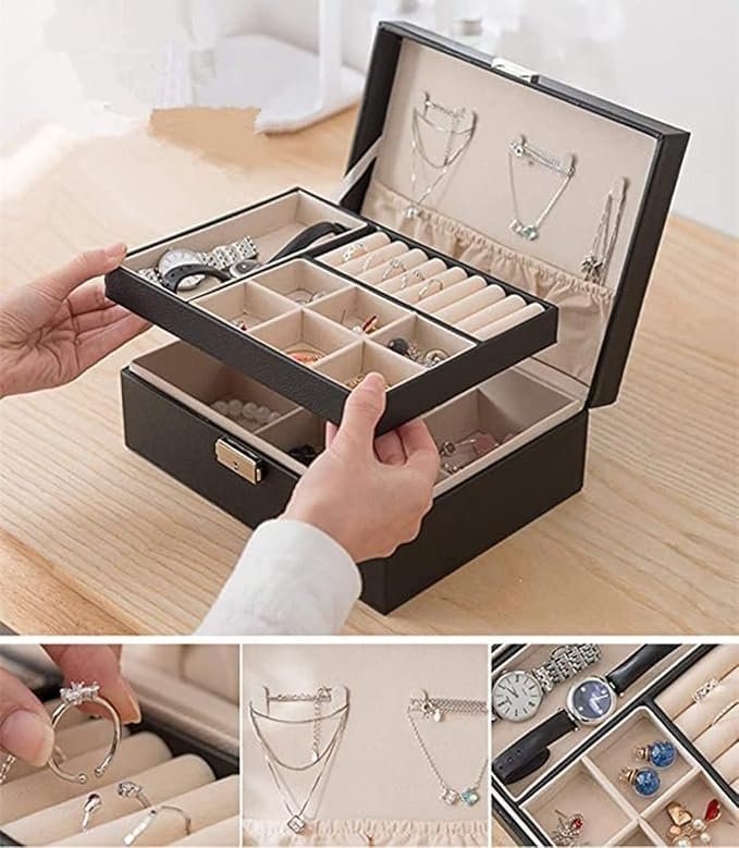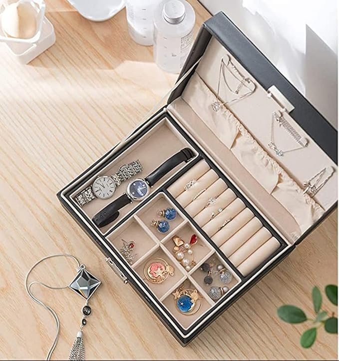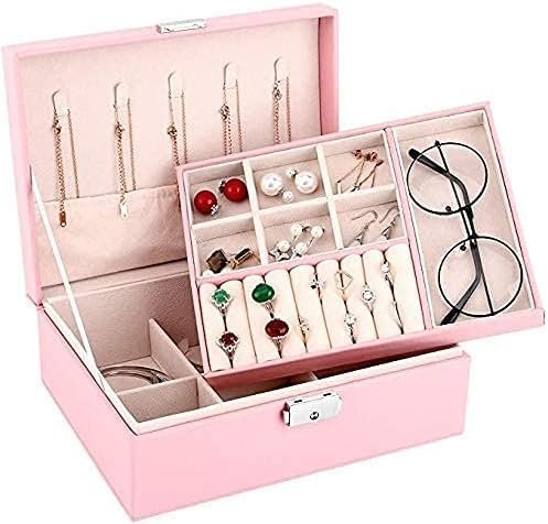 2 layers type of jewelry, making your jewelry collection more organized, L*W*H:23x17x9cm/ 9x6.7x3.5inche; Delicate lock and synthetic leather result in a harmoniousunity, making the jewellery box an eye-pleasing catch, adds a sense of tenderness and elegance to your dressing table; The exterior is made of high quality PU leather, durable, waterproof and moisture proof. The interior is made of beaded flannel, it can protect well your jewelry from scratches; Small jewellery organiser box for rings, necklaces, earrings, ear studs, cufflinks and other little jewellery. It would protect your jewellery inside against fingerprints, scratches, damages and theft