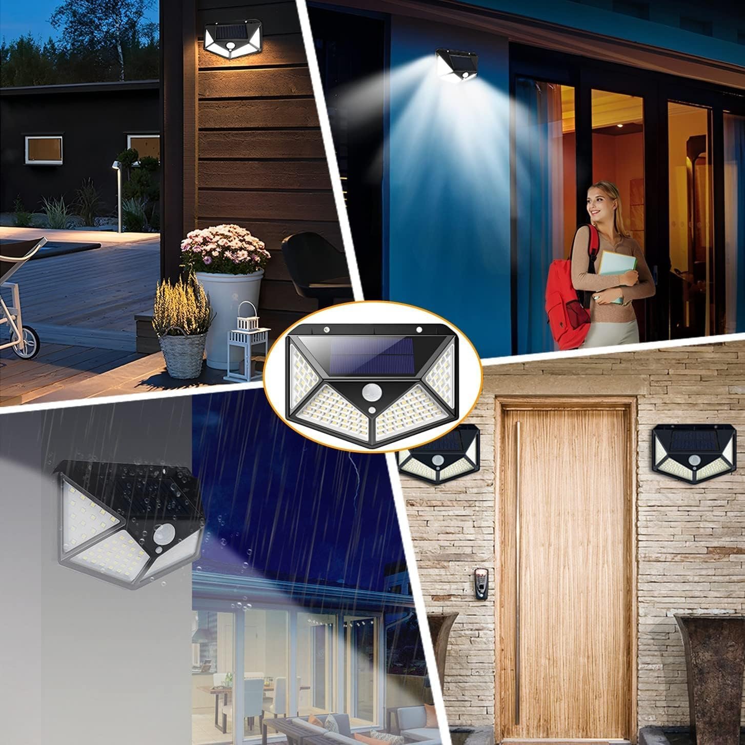 【Solar Powered Design】This solar light can automatically charge itself at daytime. It takes about 6hrs to full charge under sunlight and lights up about 8hrs at night. 【100LED Outdoor Lights】Our 4- side outdoor light adopts 100LED as light source, the lighting angle is 270 degree, providing wide illumination range to light your way in the dark. 【3 Working Modes】1. strong bright when motion detected, outdoor solar lights turns off after people leave. 2. strong bright when motion detected, light in dim mode after people leave. 3. always in dim mode all at night. 【All Weather Resistant】Sturdy ABS housing and IP65 waterproof technology make this solar lamp easily cope with various extreme bad weather conditions, no matter rainy or snowy days. 【Wide Application】This solar fence lights is easy to mount on wall by screws, no wiring required. Perfect for garden, patio, backyard, driveway, garage, fence, parking lot and more.