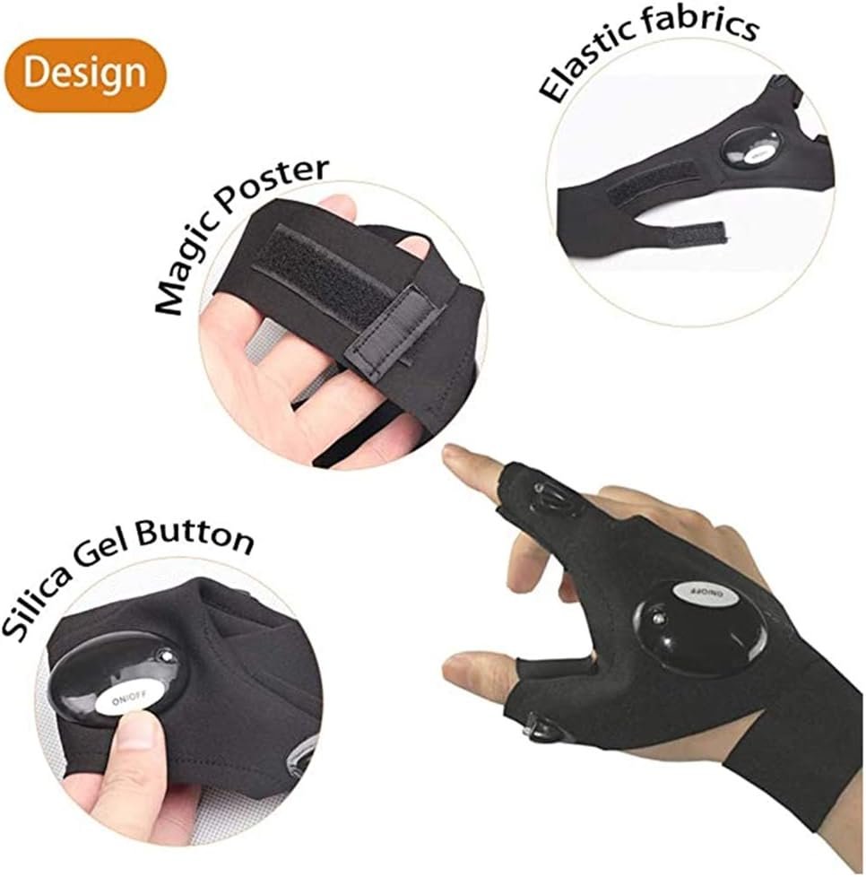 Bringing light to your fingertips, a flash torch never drops making you hands-free when repairing, and fishing. Comfortable stretched neoprene material, with position adjustable magic strap Cool gloves make you a spy at night. Easy turn on and off.SPECIFICATIONS Material: cotton; silicone; PP Size: 5.3*14.2 inches