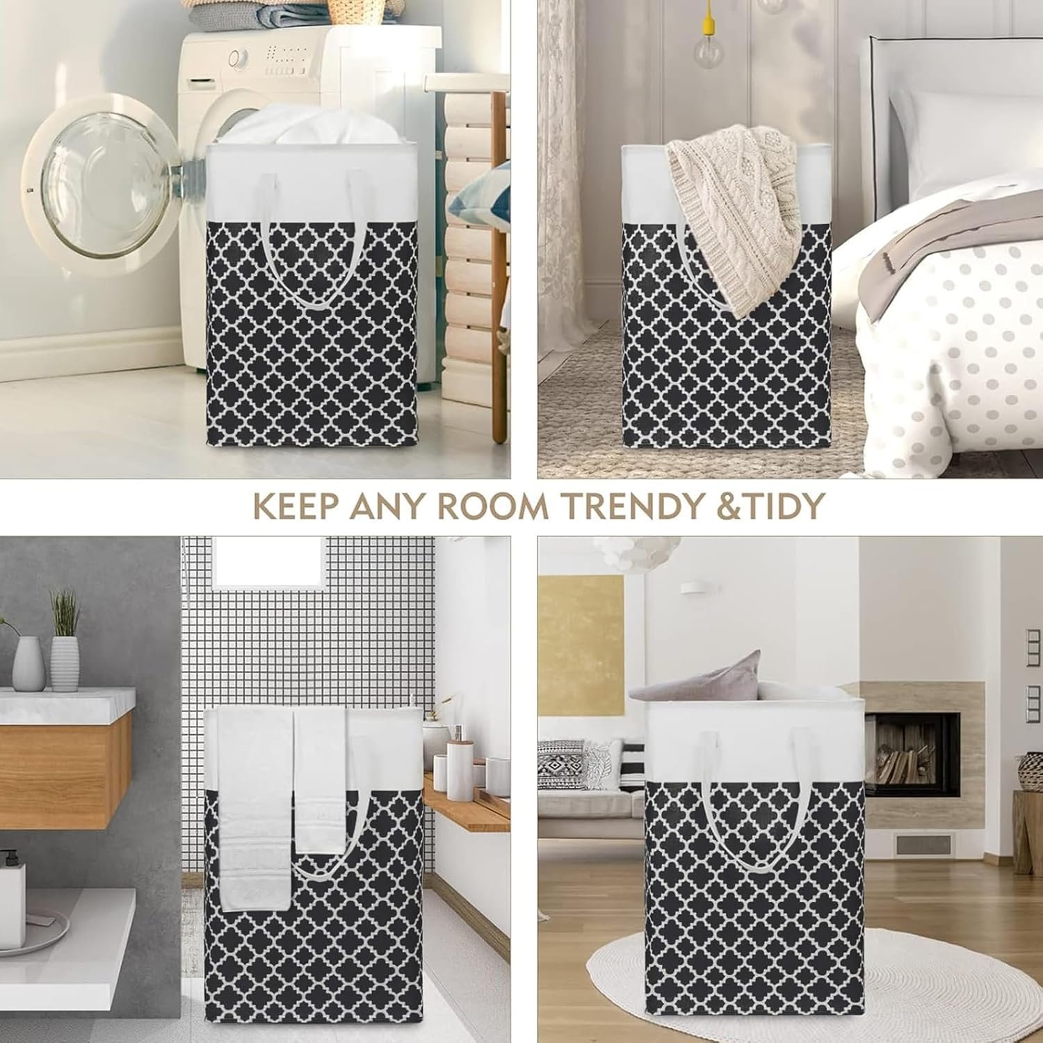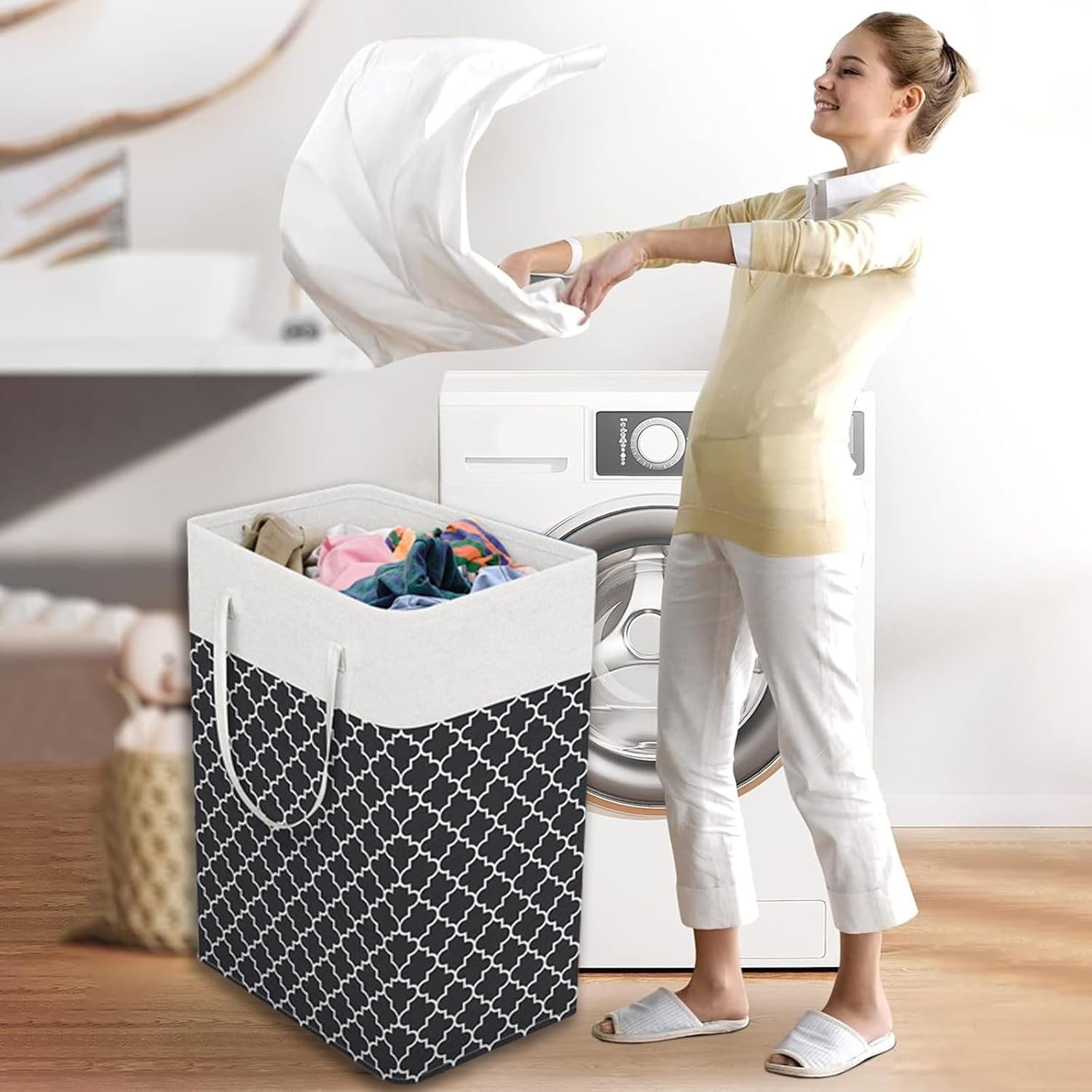 ✅UPGRADED SIZE & CAPACITY: This clothes basket has perfect size measuring 40x30x62cm and large capacity 75L a size that's just right for everyday use. Two long handles, one on each side of the tall hamper, are reinforced with durable tight stitching to prevent tearing.