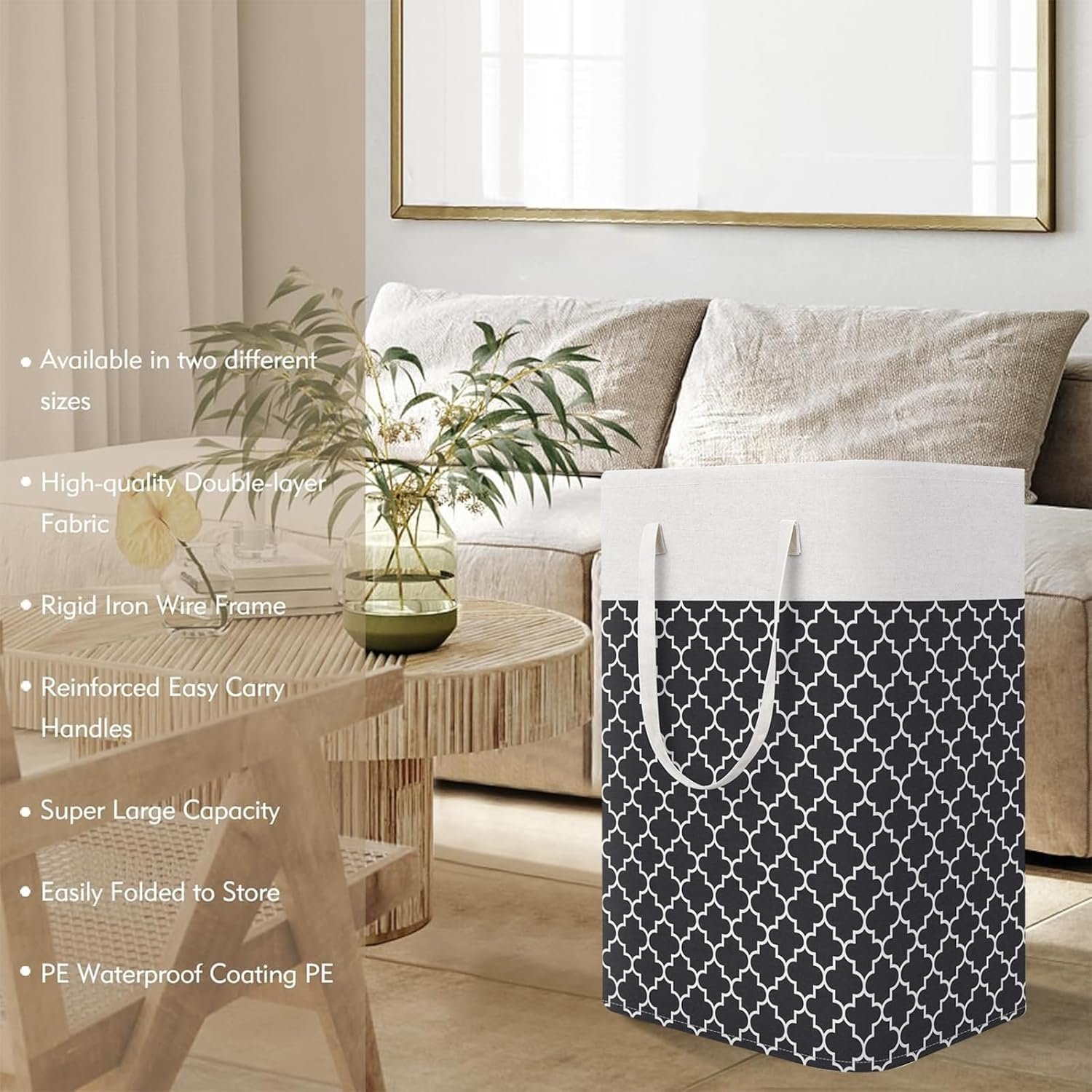 waterproof PE coating, this laundry basket features textured aluminum handles with soft sponge grips, offering a comfortable hold as you carry laundry to your bedroom, bathroom, or laundry room.