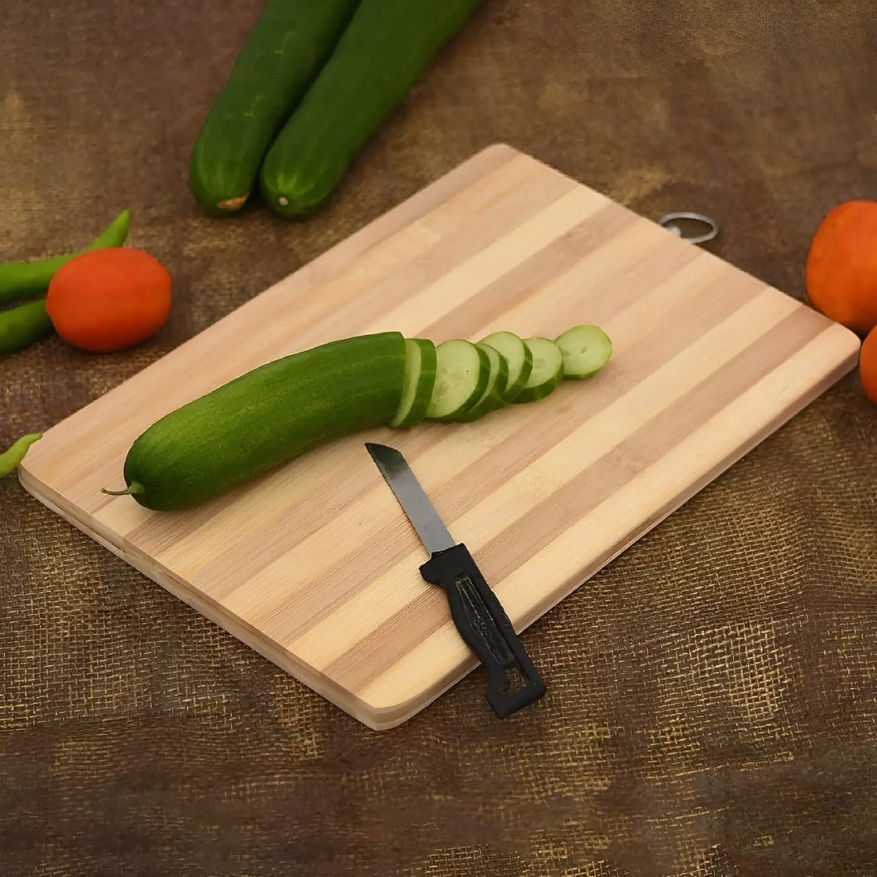 ✅ Bamboo boards have an advantage over wooden cutting boards in that they are naturally antibacterial, anti-fungal and is biodegradable ✅ The board is smooth, with no grooves, making it more hygienic and easy to clean ✅ Bamboo chopping boards have a tough, none scarring surface which will keep the sharp edge on your knife ✅ Cutting board bamboo is an Eco-friendly sustainable material, being naturally odour and stain-resistant. ✅ Can be wall hung using the aluminium handle for ease of use and storage