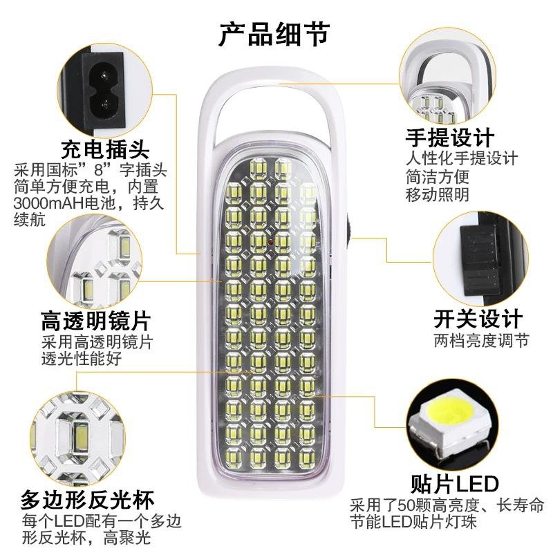 50 LED Emergency Charging Light High efficiency and long life. Low recharge time with long working hours. It can be hung or carried easily. Good for all indoor and outdoor applications.