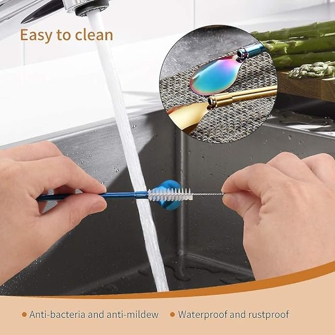 Spoons Set:The set contains 6 iced tea spoons and two brushes.The spoon fits almost into regular cups and glasses.It can be used as an ice tea spoon,coffee stirring spoon,ice cream spoon,cocktail stirring spoon,milkshakes,root beer floats.The stirring spoon is not heavy and easy to carry.For example,it is convenient and practical when you go out on a picnic with your friends or bring your portable utensils.