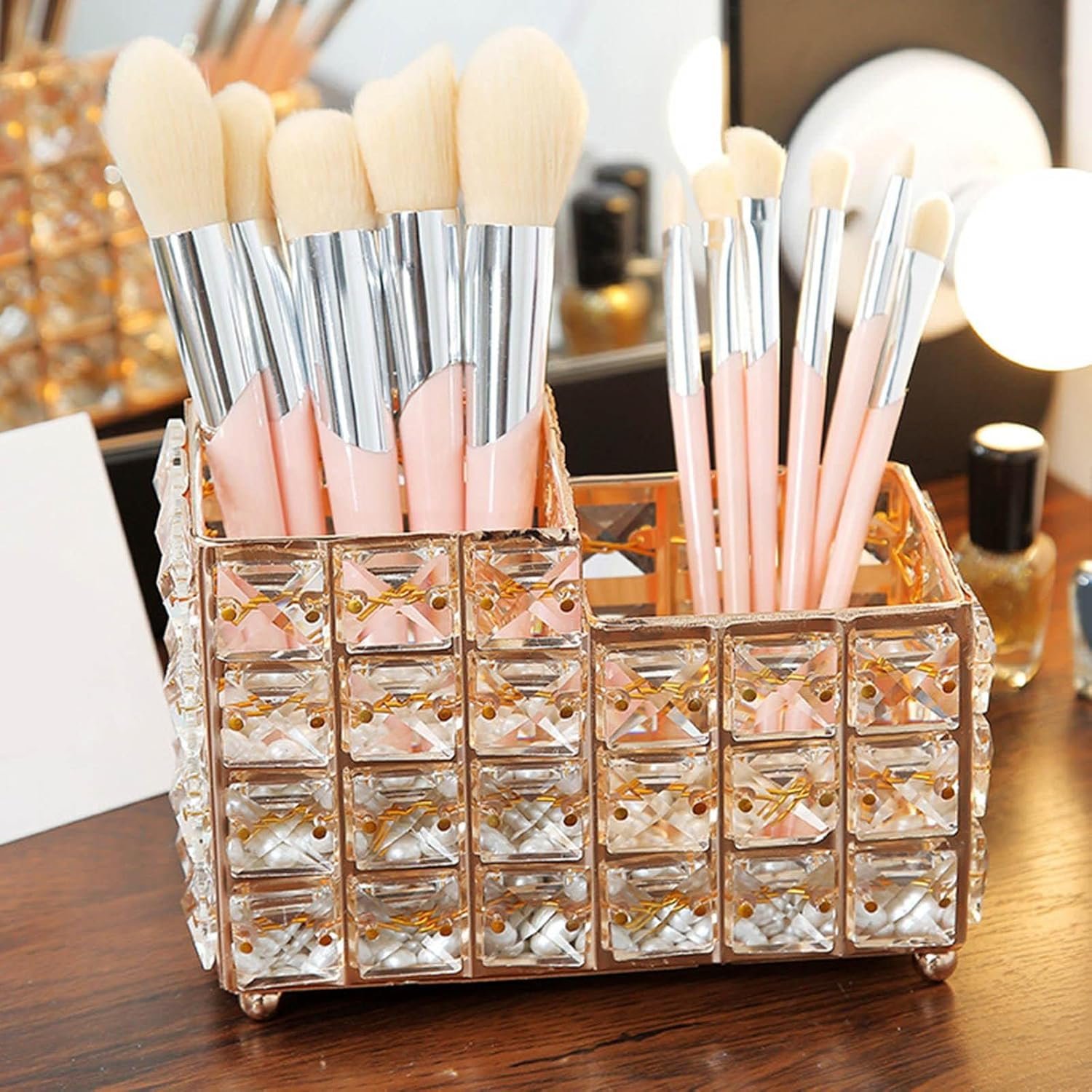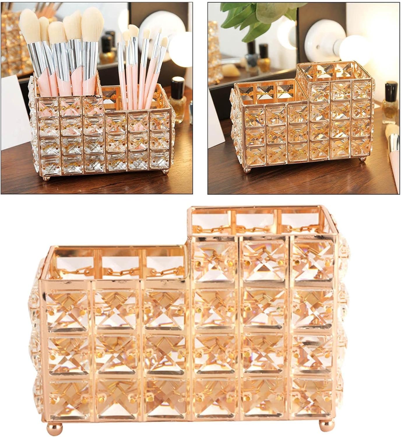 * Large Capacity: Organizes makeup brushes, lip liner, makeup palettes, nail files, pens, pencils, and more. * Collection Display: The two-compartment crystal cup adds a classic and elegant touch to your room. Perfect for decorating your vanity, desk, nightstand, or any other table in your home.