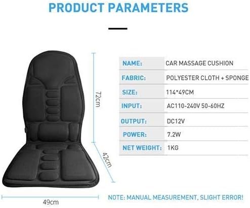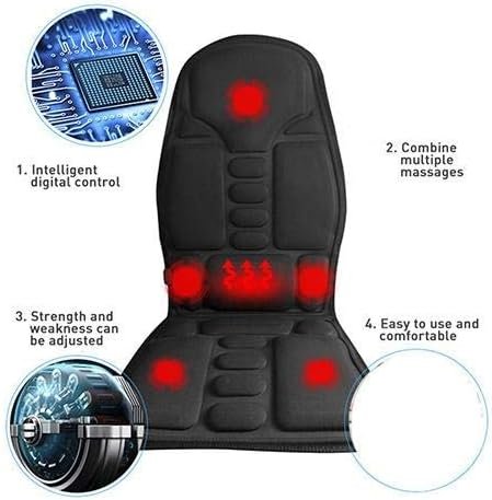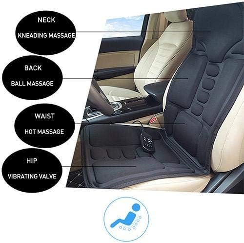 This is a portable electric massage cushion designed to be placed on a chair, sofa, recliner, or even a car seat to provide a soothing massage experience. The cushion is constructed from a durable black fabric (likely a padded foam or synthetic material) and is contoured to fit the shape of the back and upper legs, covering the entire torso and lower back. The design features multiple padded sections that house internal vibrating motors. There are distinct zones of relief: a large section for the upper and middle back, and a separate, smaller section for the lower back and seating area. The visible padding suggests comfortable support and targeted massage placement. A key functional component is the wired remote control, which connects to the main cushion via a cable. This handheld controller allows the user to easily adjust massage settings such as intensity, speed, and target zones without having to reach awkwardly behind them. The cushion's versatility allows users to enjoy a relaxing massage while sitting at work, watching television, or during a long drive.