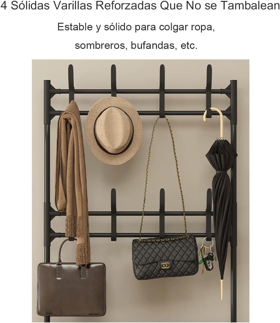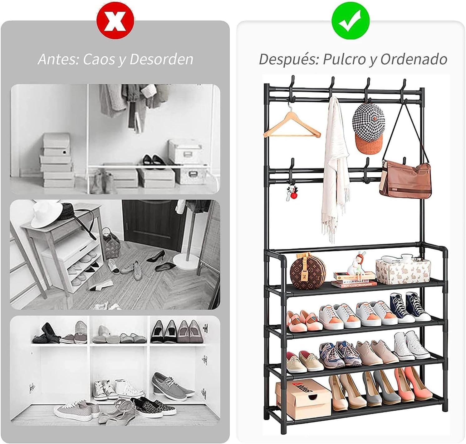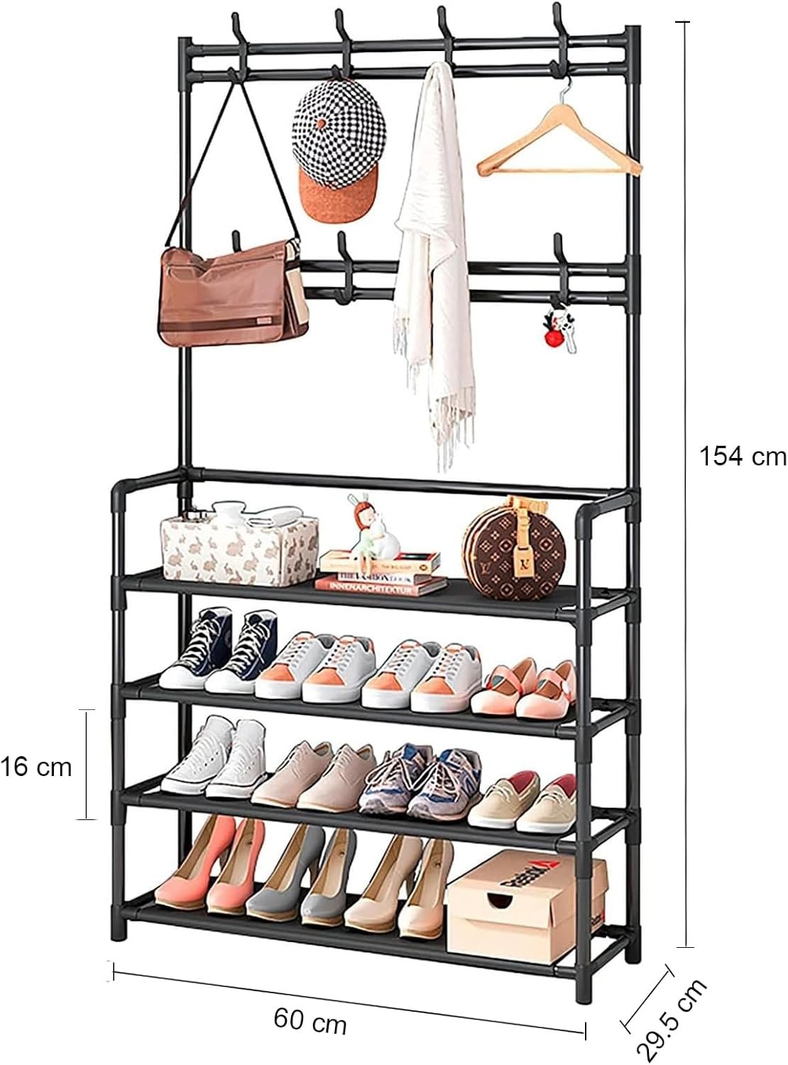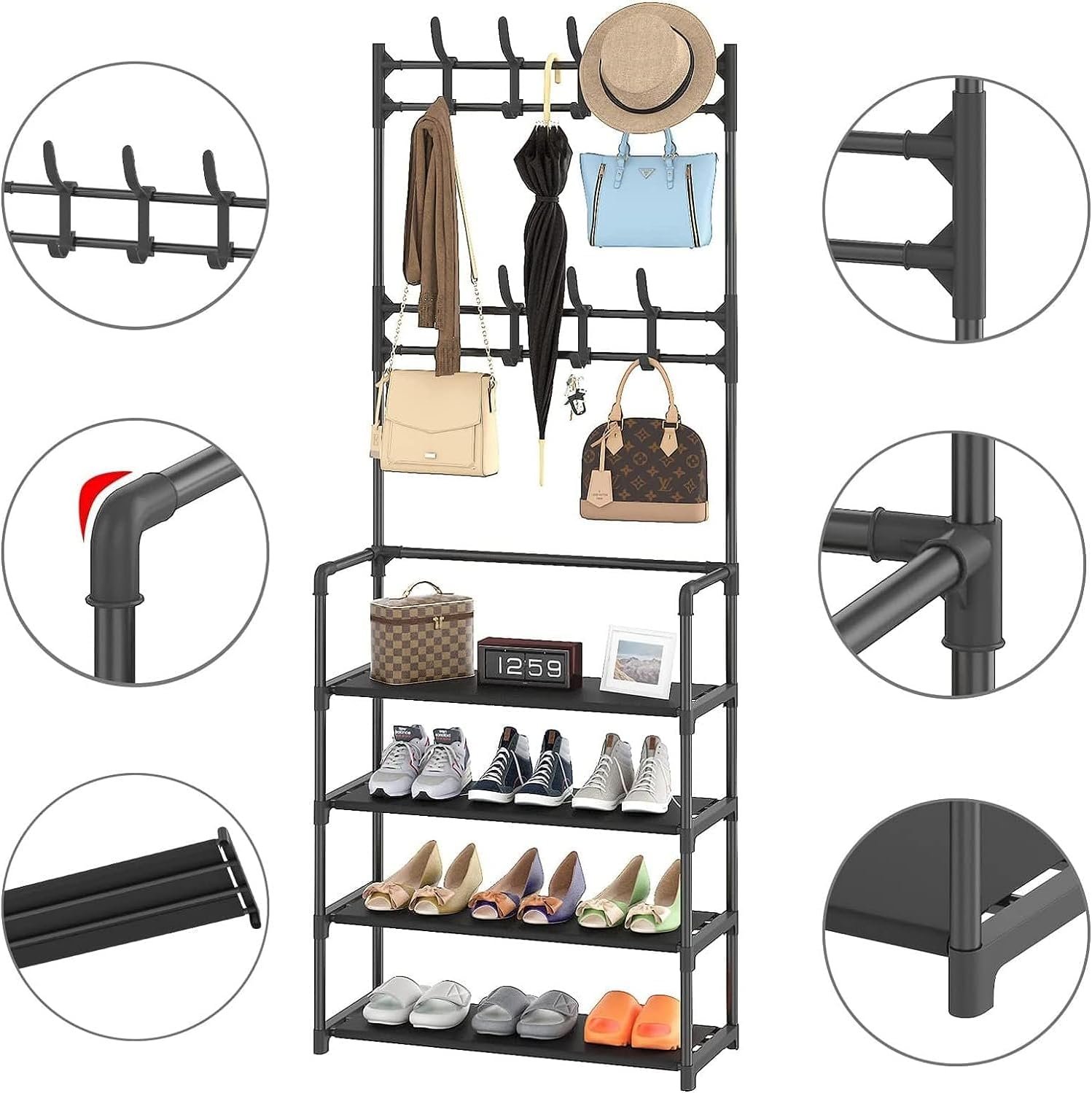 【High Quality Materials】Made of sturdy stainless steel, L-shaped design can increase stability, thickened steel tube with strong bearing capacity. 【Wide range of uses】Four-layer space for shoes, boxes, books, etc. Two rows of design hooks can hang jackets, coats, scarves, belts, backpacks, hats or umbrellas, etc., can be used as coat rack, bookshelf, shelves, effective use of space. 【Easy to Install】Quick and easy to install, the installation of shoe rack and coat rack is very fast, tool-free installation, no complicated steps, quick and easy to complete the assembly. 【Save Space】The shoe and hat rack does not take up space, can be placed in the living room, bedroom, office, front door against the corner of the wall, etc., effectively saves space and makes the home look neat and tidy.