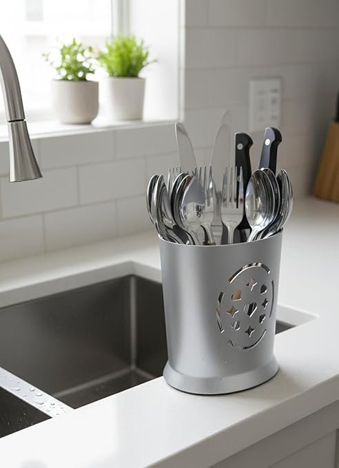 Metal/Aluminum Kitchen Cutlery Caddy and Utensil Holder (Specific and comprehensive) Modern Countertop Flatware & Utensil Storage Organizer (Focuses on organization and style) Silver Drainer Caddy for Spoons, Forks, and Knives (Highlights its use as a post-wash drainer) Decorative Kitchen Utensil Holder with Star Cutouts (Highlights the unique design feature) Function: Perfect for organizing kitchen utensils (spoons, forks, knives) or as a draining caddy next to the sink. Design: Features decorative cutouts (stars, hearts, moons) for ventilation and a modern look. Material: aluminum. Placement: Ideal for countertops, next to the sink, or on the dining table for casual dining.