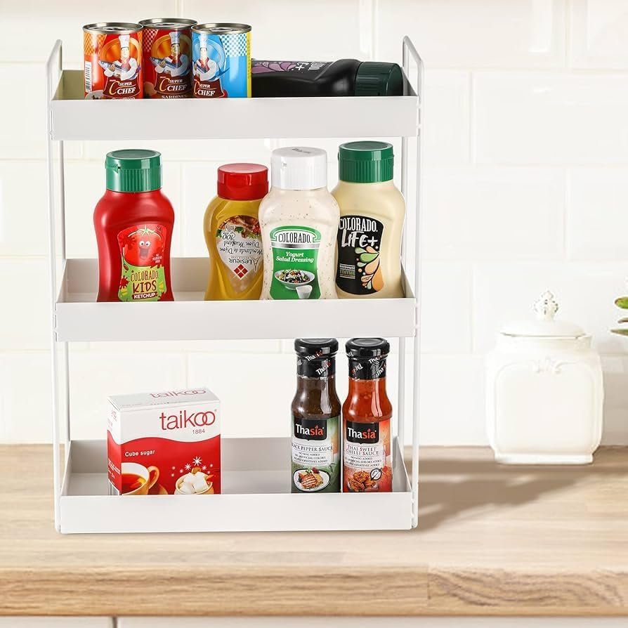 Place fruit and vegetables on the space-saving storage cart—the holes on the shelves keep them airy; you can also hang potholders and dishcloths on to easily reach them at all times What You Get: A narrow gap storage rack, to hang small items, hollow-out design for good ventilation, and an elegant look that makes it a nice add-on in your living room, kitchen, or bathroom