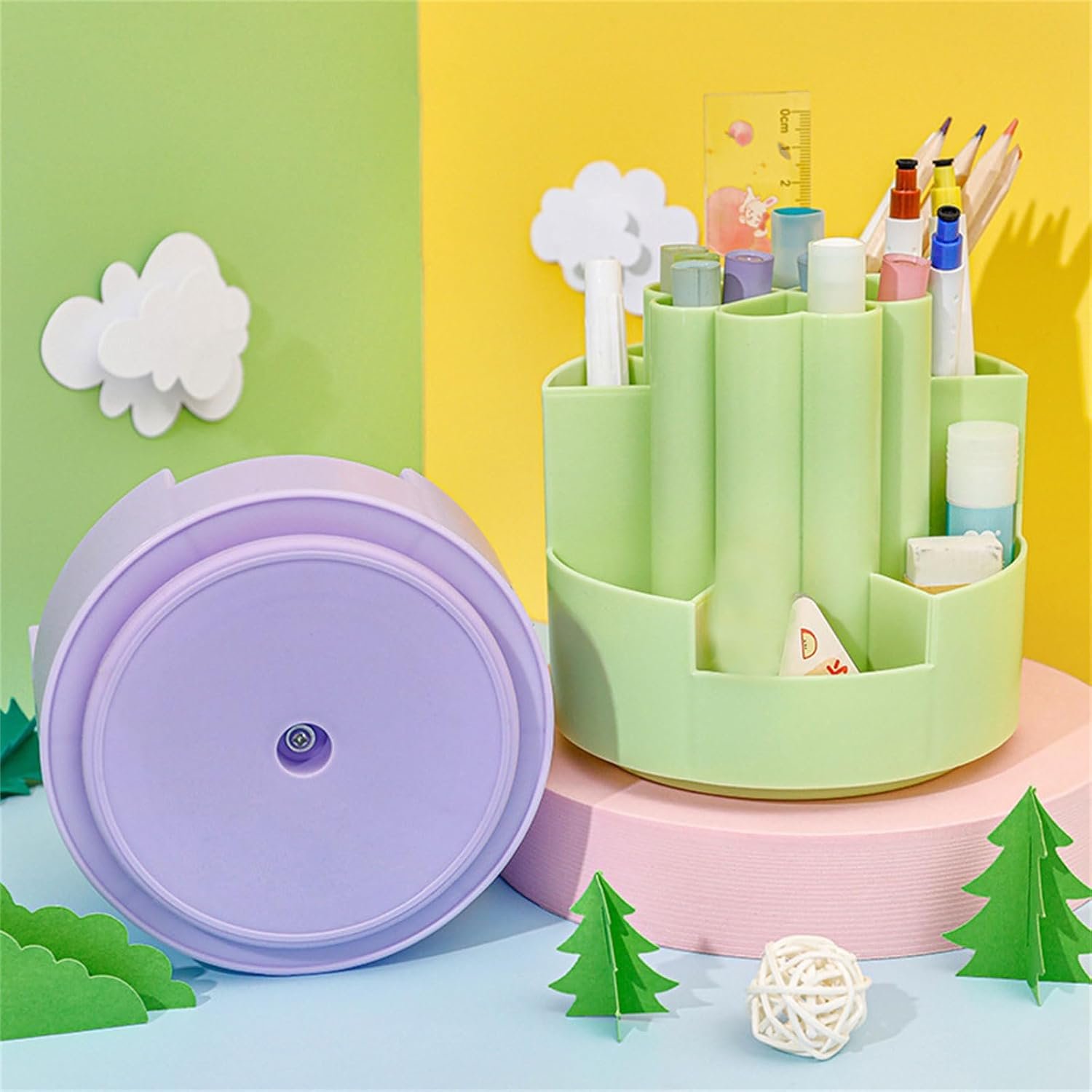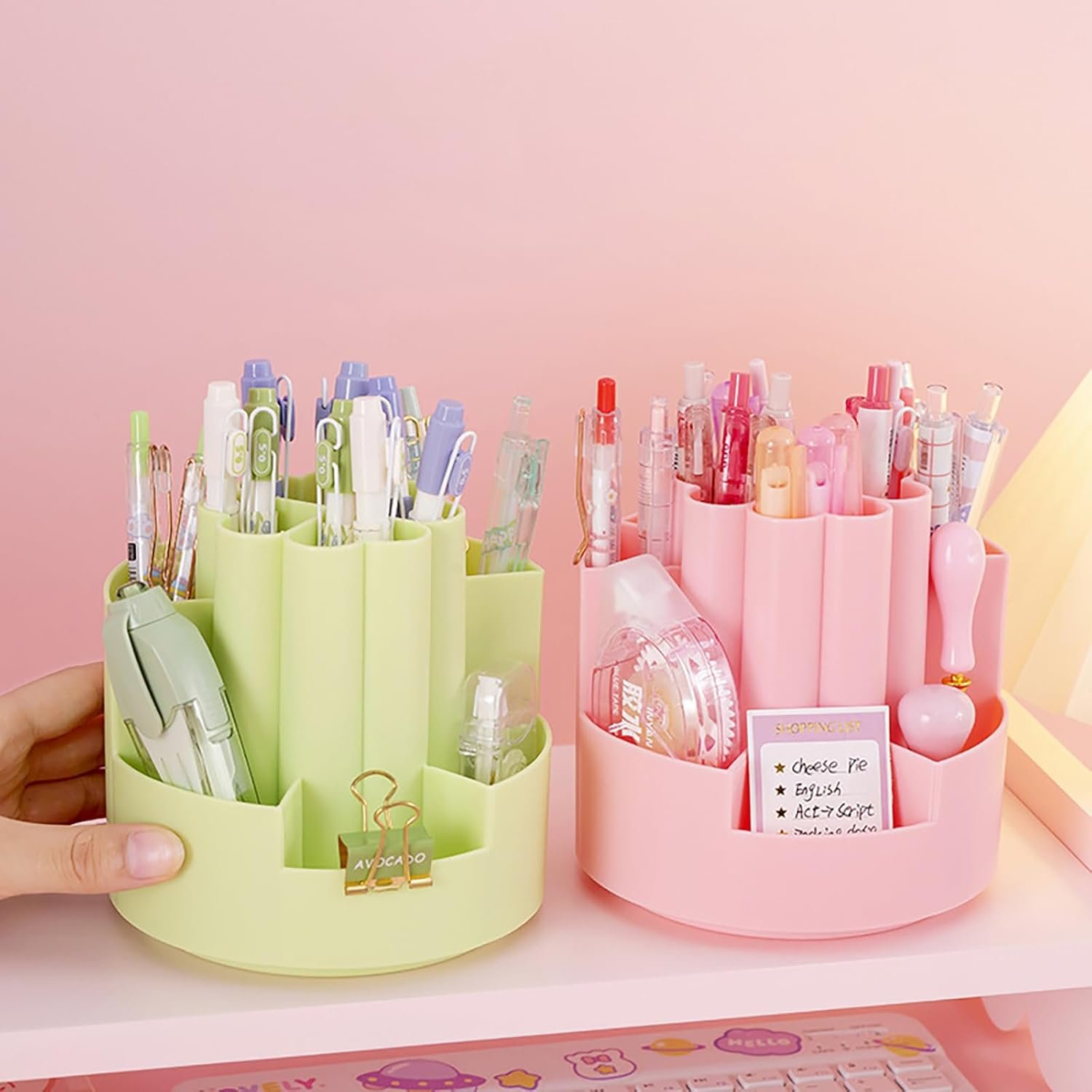 360° Rotating Pen Holder for Desk Organizer: The rotating pen holder is equipped with a base that can rotate 360 degrees and it rotates smoothly without getting stuck. The rotary desk organizer design allows you to easily access your pens, pencils and other supplies from any angle. Cute & Compact Design: 5.1 inches in diameter, the highest slot can put tall brushes, pencils, pens, rulers, pencil knives. The medium slot can put short brushes, concealer pen, mascara, scissors. The lowest slot can put lipsticks, nail polish, beauty blender, erasers, tapes, etc. Superior Material: Crafted from durable ABS plastic, desk supplies is designed for long-term use, providing exceptional strength and solidity. Rotating pen holder for desk ensures that pencil organizer maintains office supplies for desk pristine appearance over time, even with regular use. Versatile Organizers: Pen holders versatile design makes pencil cups for desk suitable for use in various rooms, such as craft rooms, playrooms, laundry rooms and even bathroom cabinets. Additionally, pen holder for desk aesthetic helps in keeping office supplies for women, remote controls, headphones, chargers and more, well-organized and within reach. Multi-Functional Use: In addition to the office, this rotating cup can also be used to organize craft supplies, makeup, sewing kits, or anything that needs compact storage on your desk or table.