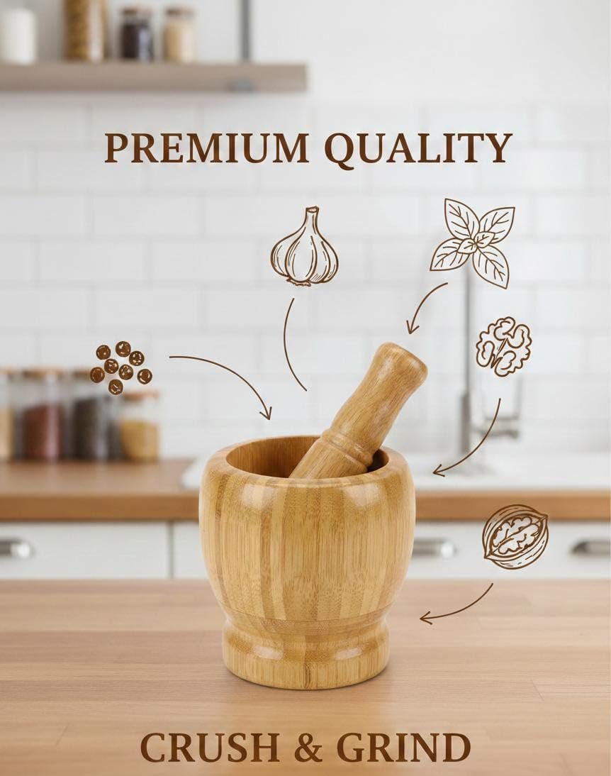Experience the essence of fresh cooking with this handcrafted Bamboo Mortar and Pestle Set Designed to be a durable and lightweight alternative to heavy stone grinders this set allows you to manually crush and grind ingredients to unlock their full aromatic potential Its natural bamboo construction is not only sustainable but also provides a warm rustic aesthetic that complements any kitchen decor Whether you are preparing a traditional pesto crushing fresh garlic or grinding whole spices this set ensures a smooth and efficient process every time