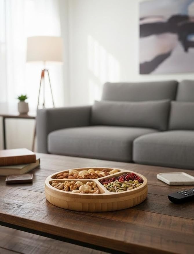 The deep sections are perfect for organizing balanced meals, including proteins, veggies, and grains, or for creating a beautiful charcuterie spread. Unlike plastic plates, our bamboo tray is biodegradable and adds a touch of nature to your lifestyle.