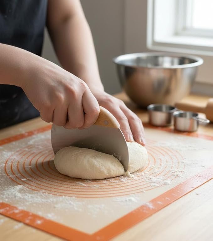 This professional-grade bench scraper is an essential tool for any baker or home cook, designed to bring precision and efficiency to your kitchen. Featuring a durable stainless steel blade with a wide, curved edge, it excels at portioning dough, scraping surfaces clean, and chopping vegetables into uniform pieces. The top of the blade is securely fastened to a smooth, ergonomic wooden handle with reinforced rivets, providing a comfortable and controlled grip during heavy use. To ensure perfect results every time, the blade face includes laser-etched measurement markings along the edge and a convenient quick-conversion chart for kitchen math at a glance.