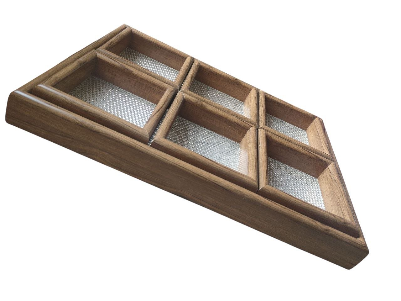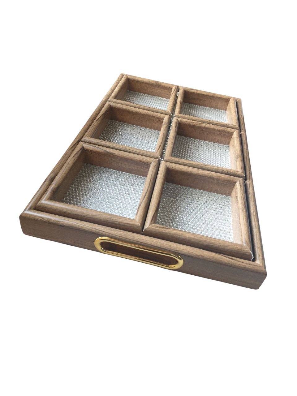 Exquisite Design: Elegant wooden box with three separate compartments and an acrylic lid adorned with attractive crystal engravings. Versatile: Perfect for storing and presenting nuts, sweets, jewelry, and small accessories. Industrial Quality: Made of durable wood with a professional finish and a high-quality clear acrylic lid. Convenient Organization: Internally divided into three equal sections for neatly organizing and separating contents. Practical Design: Easy to clean and maintain, with a removable lid for easy access to contents.