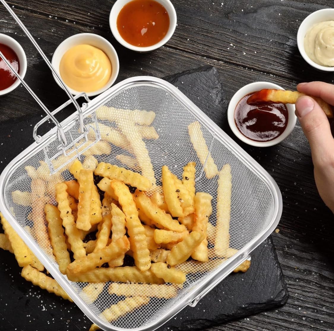 Safe for You Made of high-quality stainless steel, Fryer Basket is designed with ultra-fine mesh and catches splatters to keep hot oil, grease, boiling water, and food particles from splashing you and burning you Easy for Cleaning Fryer Basket is heat-resistant, non-stick, and quick to clean, dishwasher safe, removable splashback is easy to install and clean