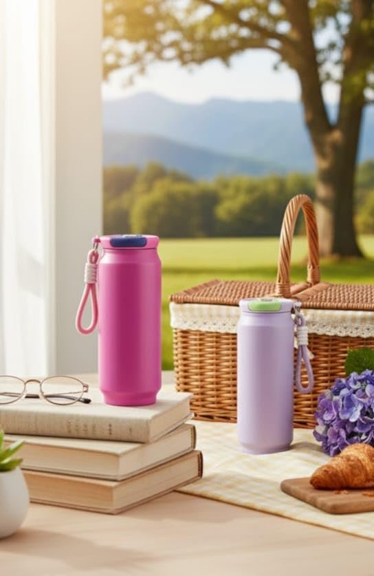 An insulated water bottle featuring a creative design that mimics the shape of a soda can available in appealing colors like bright pink and soft lilac The bottle has a capacity of 500ml and is engineered for convenience and practical use The body is constructed from SUS304 material indicating it is made from 304-grade stainless steel known for its durability and corrosion resistance The bottle offers durable insulation and is completely sealed without leakage Its handheld design makes it easy to carry making it an ideal choice for use on the go or while traveling