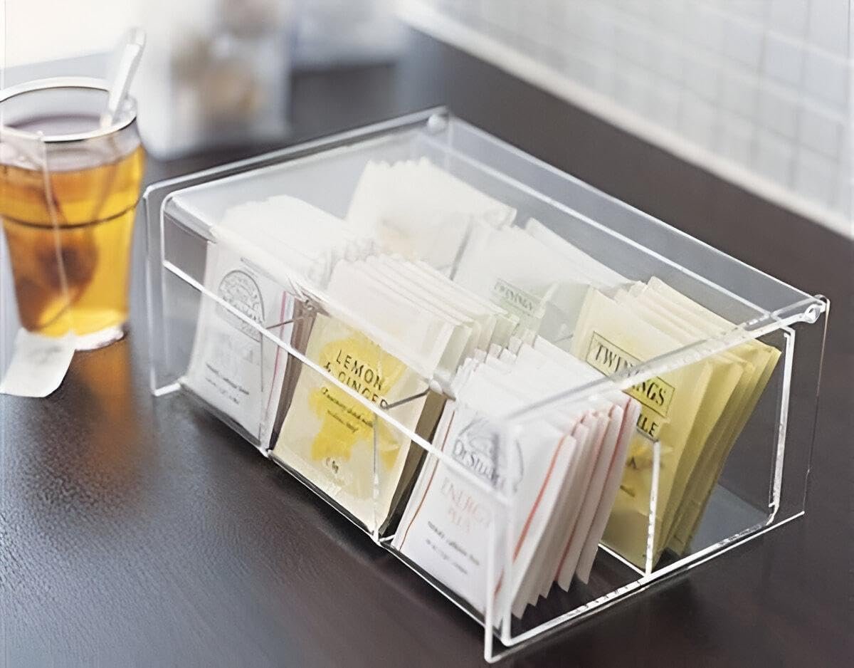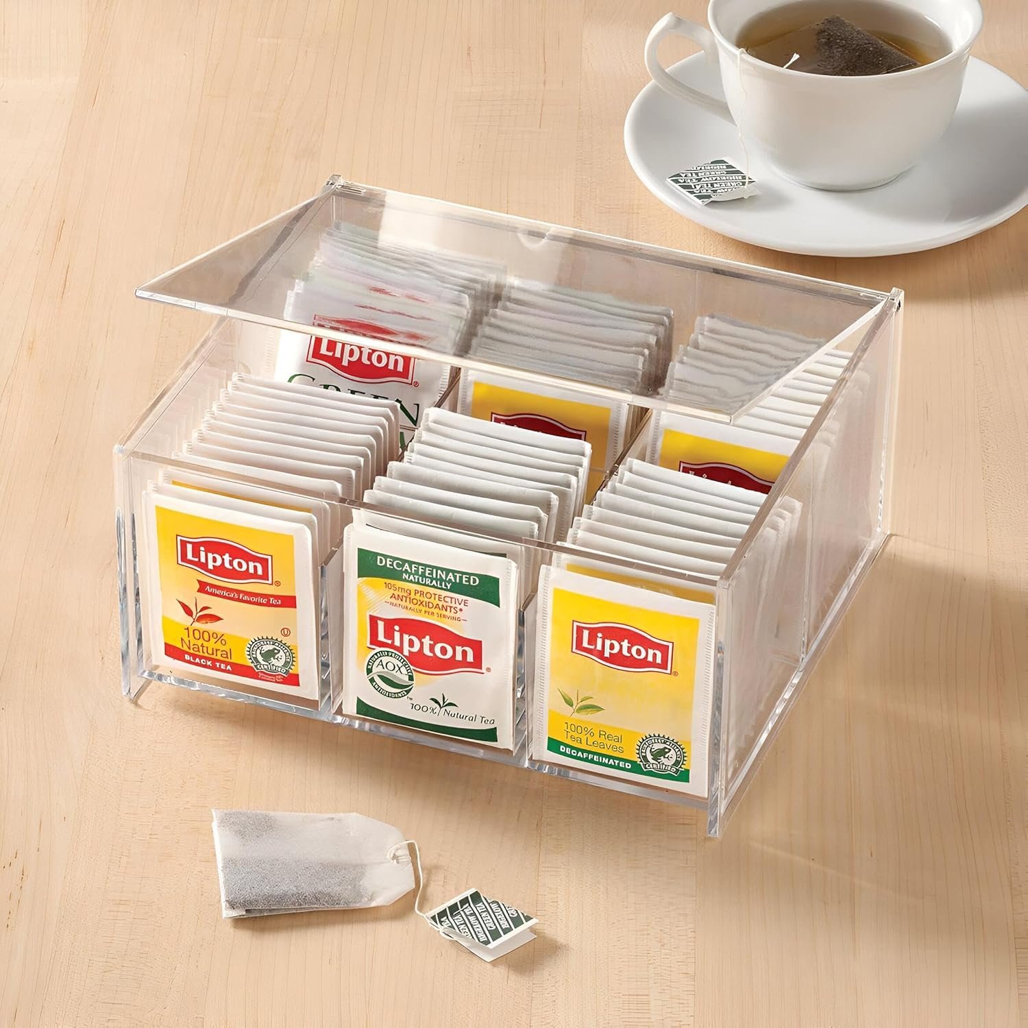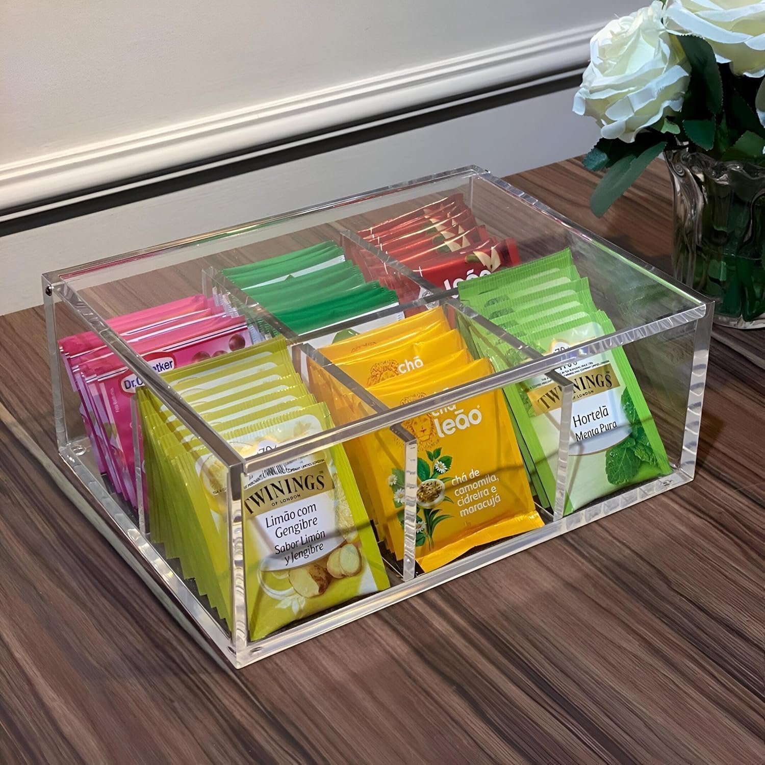 Handcrafted Clear Acrylic Tea Bag Organizer It has 6 compartments to neatly store all your favorite tea bags. This tea bag storage box features a modern design that blends with any décor, from your countertop to your pantry and even your desk. Equipped with a hinged lid, it's lightweight and dirt-free, making it the perfect gift.