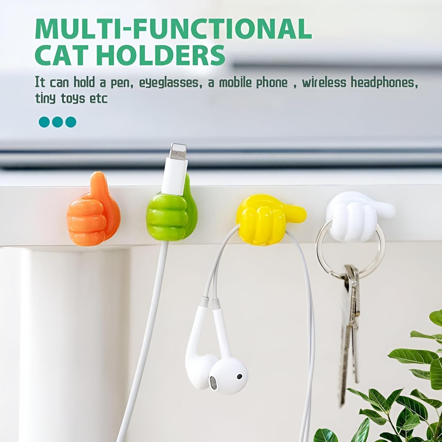 【Multipurpose Hook】Not only can this practical silicone thumb hook Self-adhesive be used as a hook to hang towels,glasses, razors, keys, kitchen racks, toothbrush, pen, clothes, belt, plant flower, hat, but also as a cable clips cord holder to organize plug, cables, cords and any other fittings.