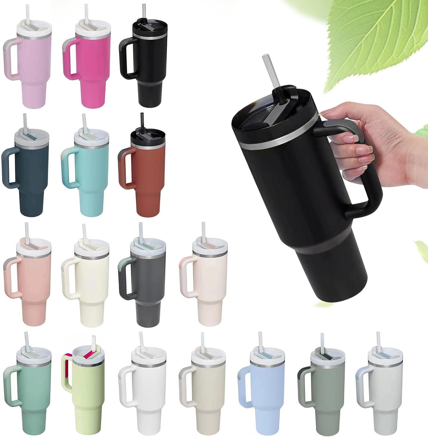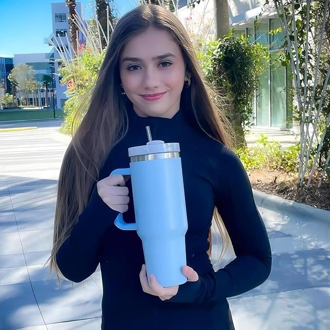 Keep your drink hot or cold: With its vacuum design, this thermal mug keeps your drinks at the perfect temperature for hours. Whether you prefer hot coffee or ice water, this mug is for you. PERFECT TUMBLER WITH HANDLE Vacuum insulated stainless steel tumbler with handle, straw lid and straw, additionally paired with stainless steel straw and silicone cup holder. The BPA-free lid ensures your health and peace of mind, while the wide mouth design makes it easy to clean and refill. Fashionable and durable: perfect for busy days. This insulated tumbler with handle is made of high quality materials to keep your drink hot or cold for up to 24 hours. Drinking from a cup with straw and lid for adults is a whole new level of drinking. LEAK PROOF & LEAK PROOF LID The leak proof lid ensures your drink stays in place even if you accidentally knock your tumbler over. Wide mouth design makes it easy to put ice and fruits in and easy to clean. Each mug comes with 1 lid and 1 straw. MULTIPURPOSE Use this insulated tumbler with straw for drinks like water, coffee, tea, juice, smoothies and more. With a capacity of 1.2L, a water cup with straw and lid is always practical.