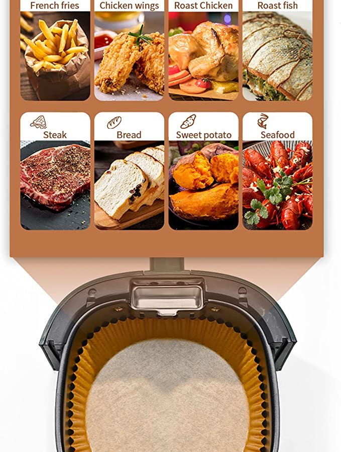 Food-grade Material: Made of food-grade parchment, waterproof, oil-proof and heat-resistant, carefully selected paper that can be used with healthy food, baking paper for air fryer does not need to be cleaned, air fryer liners round healthy and environmentally friendly contact with food is more secure. Food grade baking pad paper for roasting microwave. Air fryer disposable liners keep your air fryer machines and other utensils clean and tidy without food scraps.