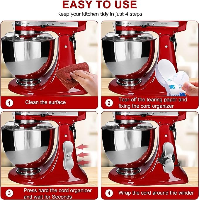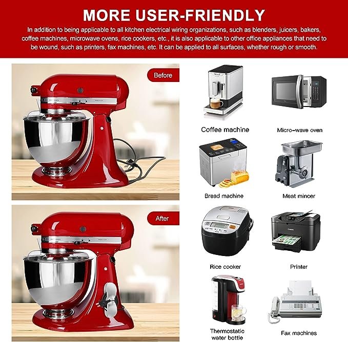 No more messy cord- Our Cord storage and organizer can make your kitchen equipment orderly and tidy, and no more messy wires can cause danger and damage at will. The easy-to-use kitchen gadget can get rid of your trouble of sorting, save your time and energy, and is an essential and convenient tool for kitchenaid, home and office.
