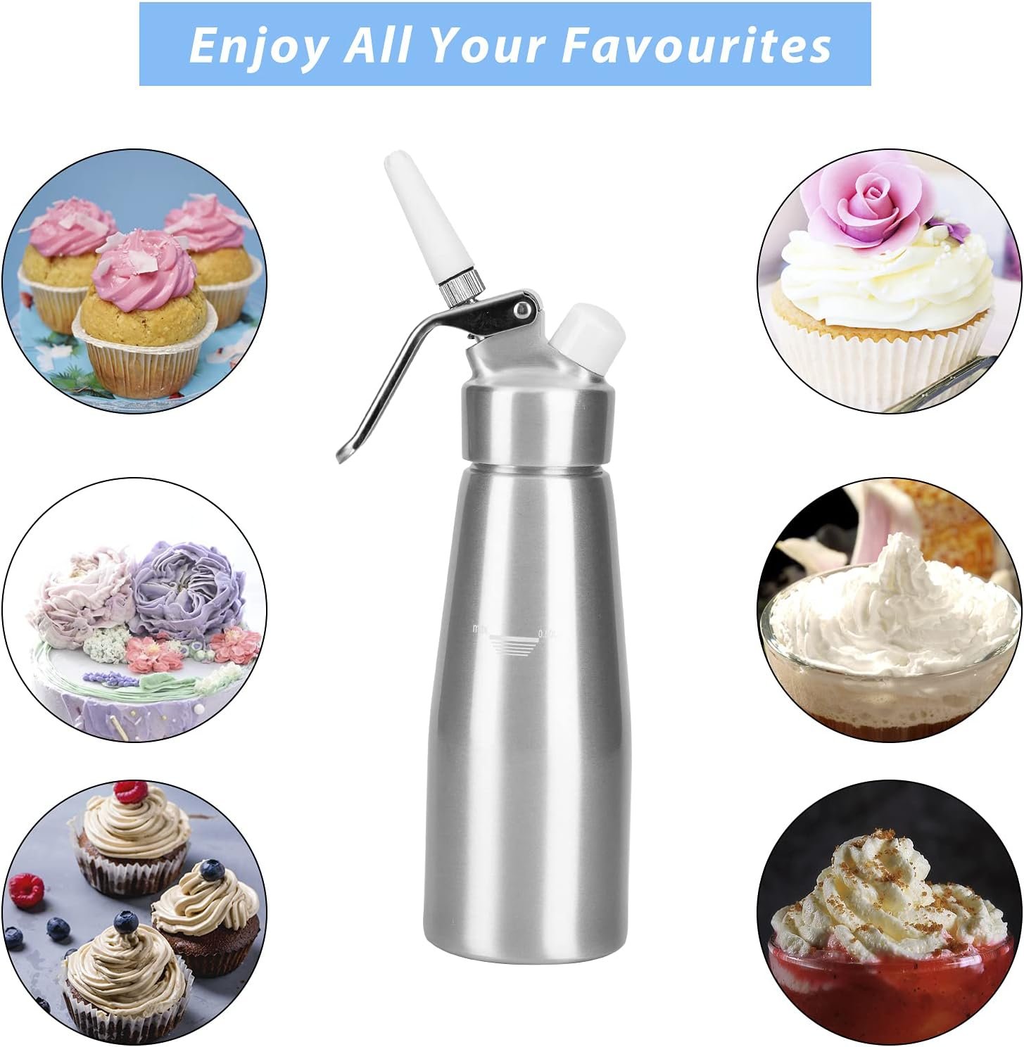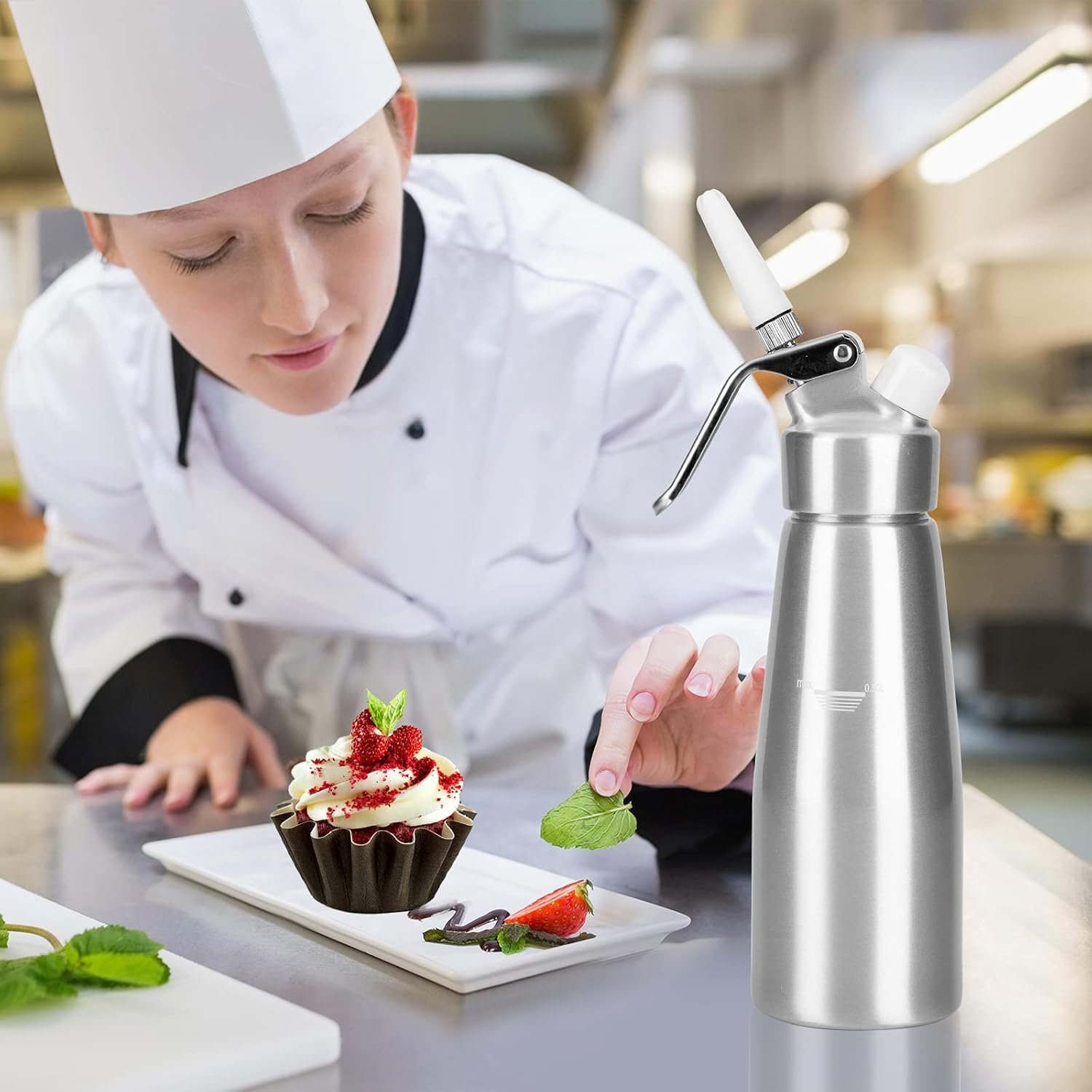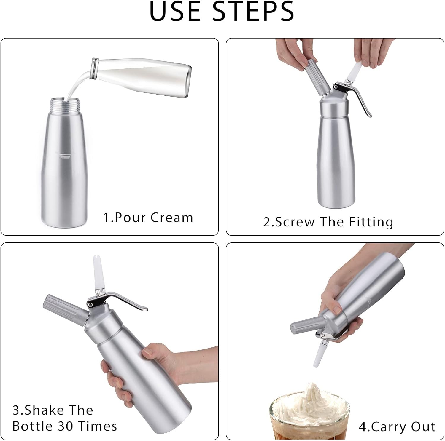❤ Profession Cream Whipper: This cream dispenser can let you decoration great for soda stream, nitro cold brew coffee, coconut cream, froth latte, cake, pastry fillings, butter, etc,. that is perfect for catering and baking. ❤ Nozzles: Contains different nozzles, all of which are ideal for various decorative and functional purposes. Also includes can loader, lid seal and nozzle cleaning brush. ❤ Easy to Use and Clean: Easy to clean smaller parts.1000ml of whipped cream can make 2L of whipped cream in 30 seconds. Help you make impressive desserts, mousses, soups and sauces.