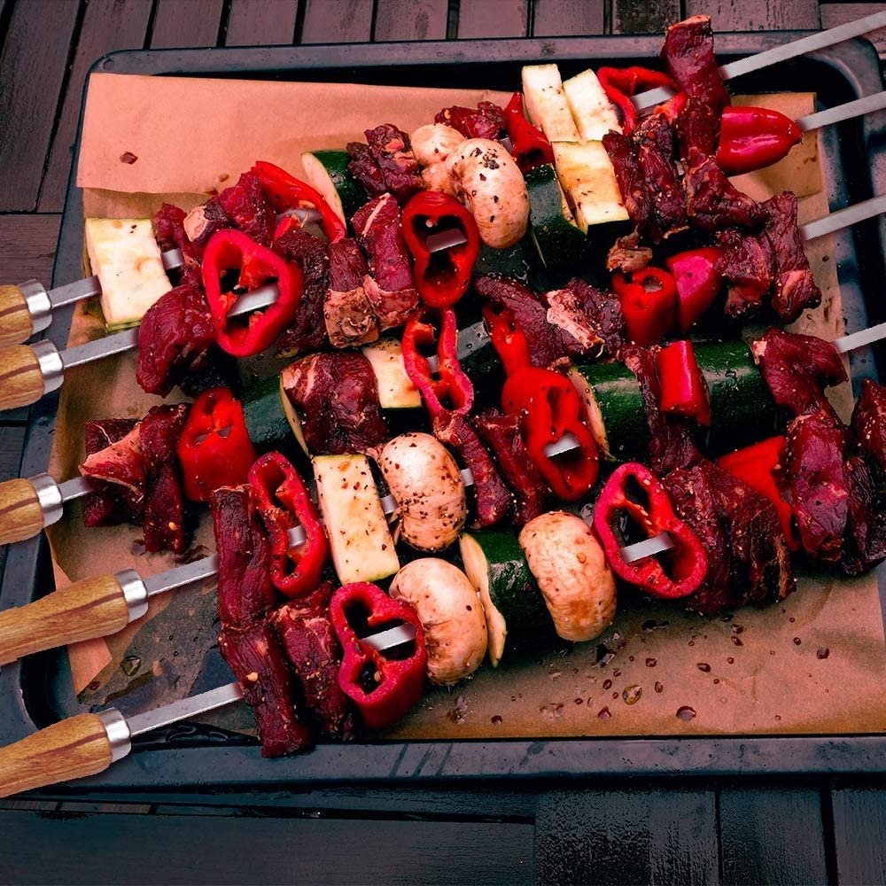 PREMIUM STAINLESS STEEL: The skewers are made of premium stainless steel which is food grade, rust proof and heat resistant. They can be contacted with food safely. The thickness of our metal skewers is 2 mm which is thick enough to allow you put more weight on each bbq skewers without getting bent or twisted. Each skewer with a food grade silicone tip to protect your kebab skewers and hands.
