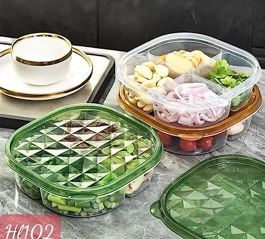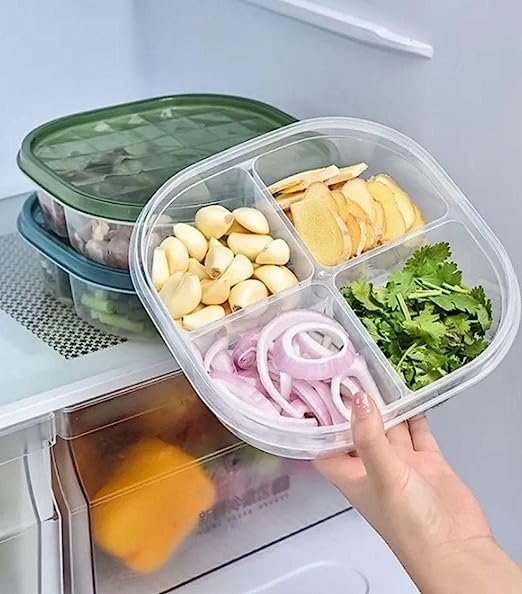 Plastic food storage box divided into 4 large compartments, food storage box with lid in the refrigerator is convenient