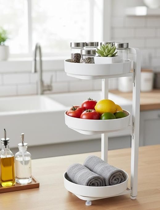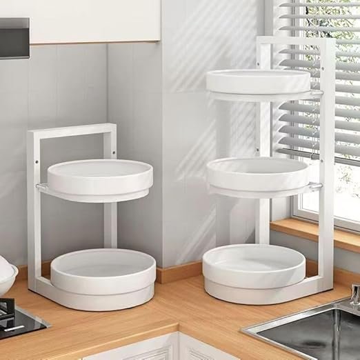 3-Tier Corner Rotating Organizer / Storage Shelf This sleek and practical 3-tier rotating storage shelf is the perfect solution for maximizing space in small areas, particularly corners. Designed with both form and function in mind, its minimalist white finish and contemporary structure will blend seamlessly into any room decor.Key Features: Space-Saving Design: Engineered to fit neatly into corners, making it an ideal choice for compact kitchens, bathrooms, laundry rooms, or pantries. * Three Tiers of Storage: Provides ample vertical storage space with three circular, lipped trays to keep items secure and prevent spills or roll-offs. * Rotating Trays (Inferred): The design strongly suggests the trays swivel or rotate independently or as a unit, providing easy 360-degree access to all contents, even those stored in the back of the corner. (A rotating feature is typical for this style of corner organizer.) * Durable Construction: Built with a sturdy vertical frame (likely metal or durable plastic) and robust shelf trays. * Versatile Use: Excellent for organizing spices and condiments in the kitchen, toiletries and cosmetics in the bathroom, cleaning supplies in the laundry room, or even small craft supplies. * Easy to Clean: The smooth white surfaces are easy to wipe down and maintain. Ideal For: Maximizing storage in tight spaces. * Keeping frequently used items neatly organized and easily accessible. * Adding a modern, clean look to any storage area.