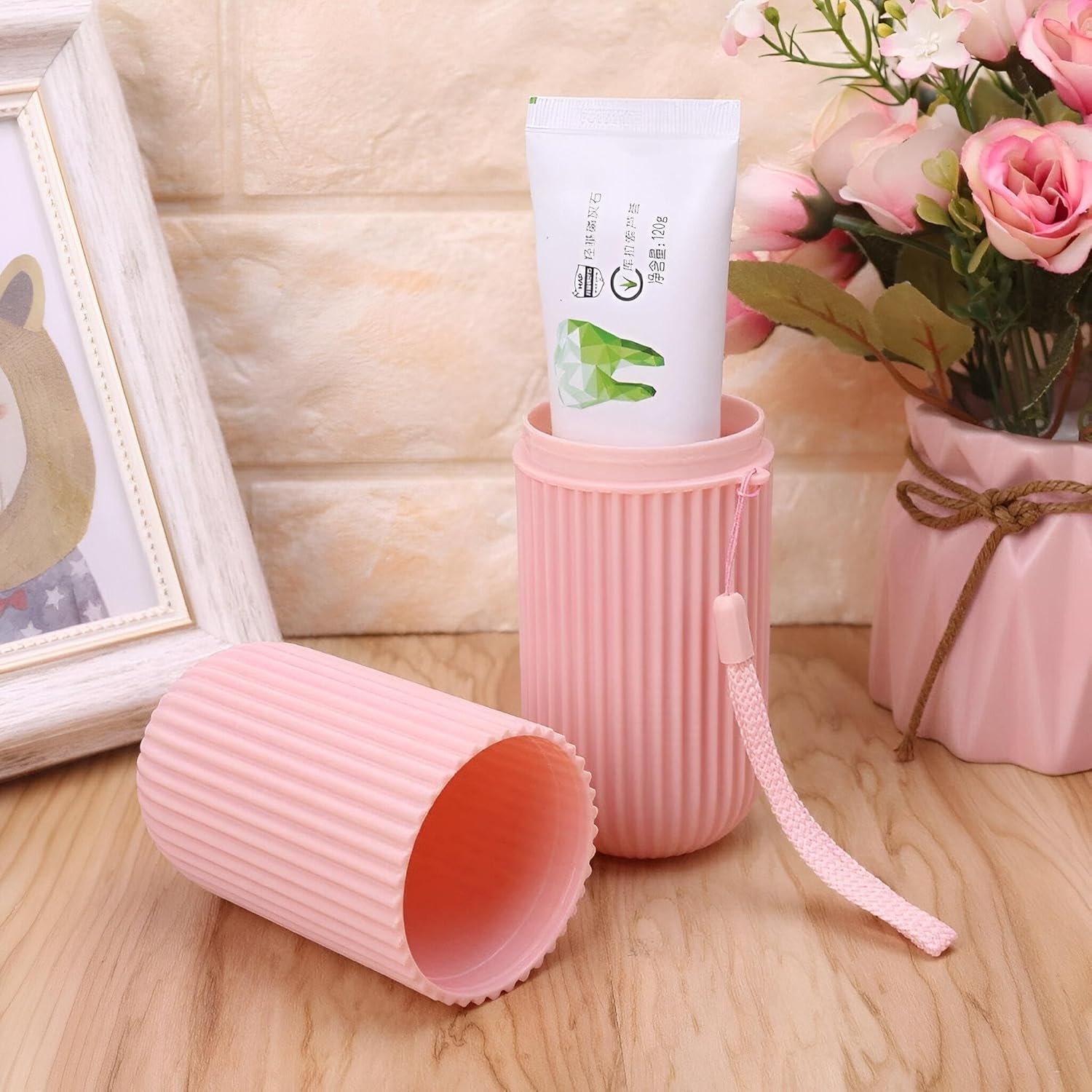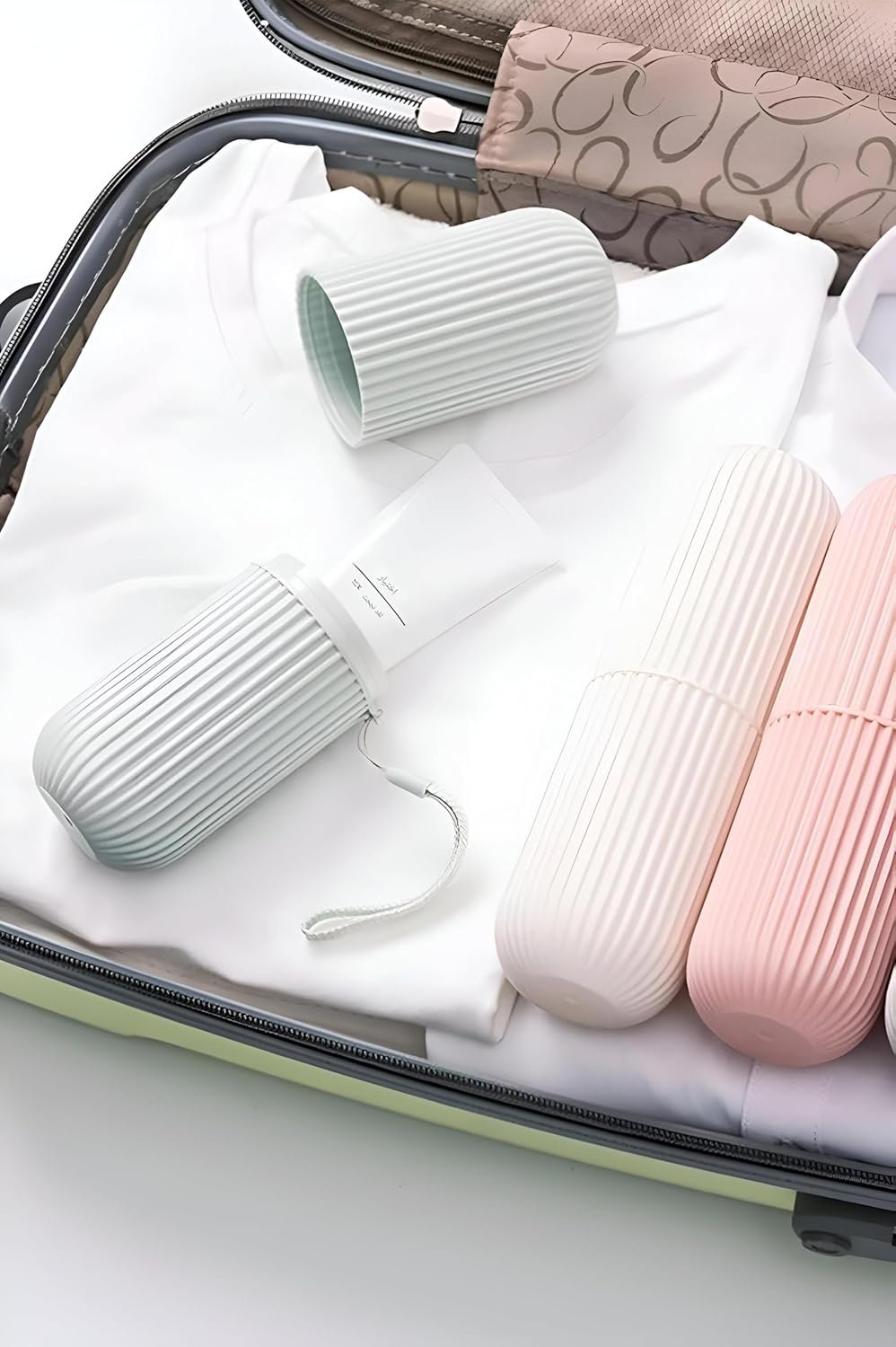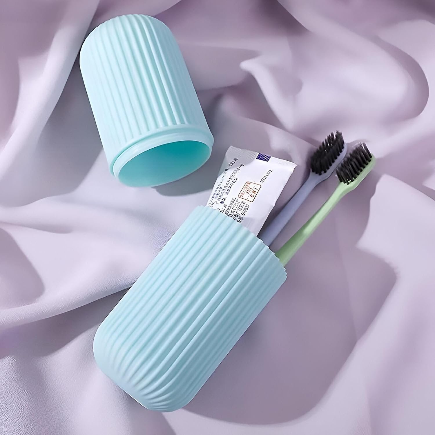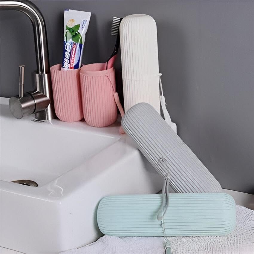 This capsule toothbrush tray holder is a versatile travel accessory that safely stores and regulates toothbrush and toothpaste. The compact design also functions as a tumbler cup with a lid, providing additional benefit as a storage box for other small items such as office supplies or cosmetics.